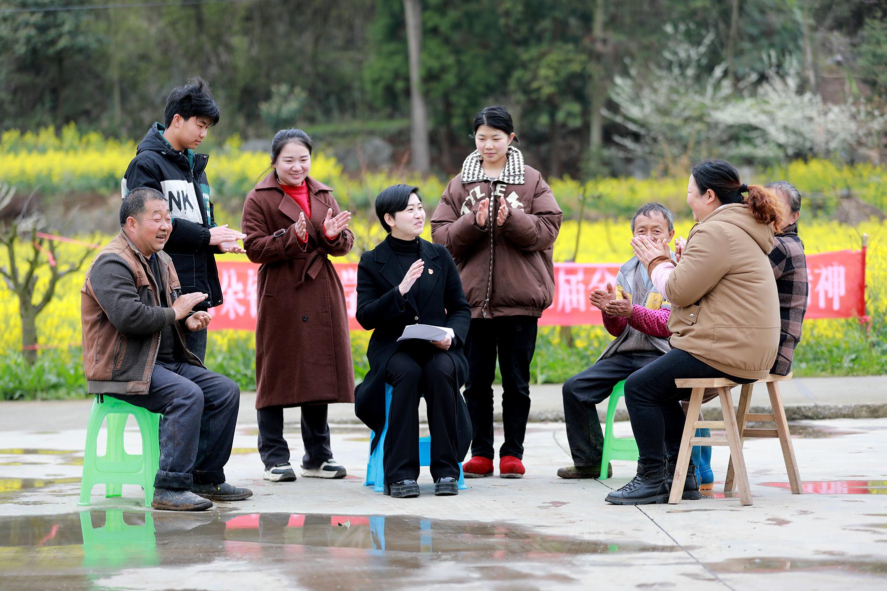 3月19日,全國(guó)人大代表、貴州省黔西市雨朵鎮(zhèn)黨委書(shū)記付慶梅(左四)在雨朵鎮(zhèn)小水井村,向村民傳達(dá)兩會(huì)精神,分享感受和體會(huì)。