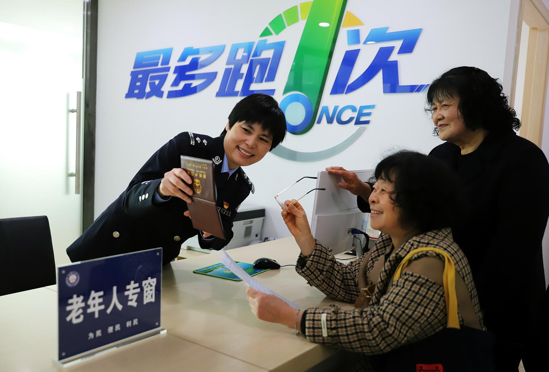 4月7日,浙江省臺(tái)州市公安局路橋分局橫街派出所民警在“老年人專窗”為老年人辦理戶籍業(yè)務(wù)。今年以來,臺(tái)州市公安局路橋分局為方便老年人辦事,各辦證窗口專門開設(shè)了老年人服務(wù)窗口。