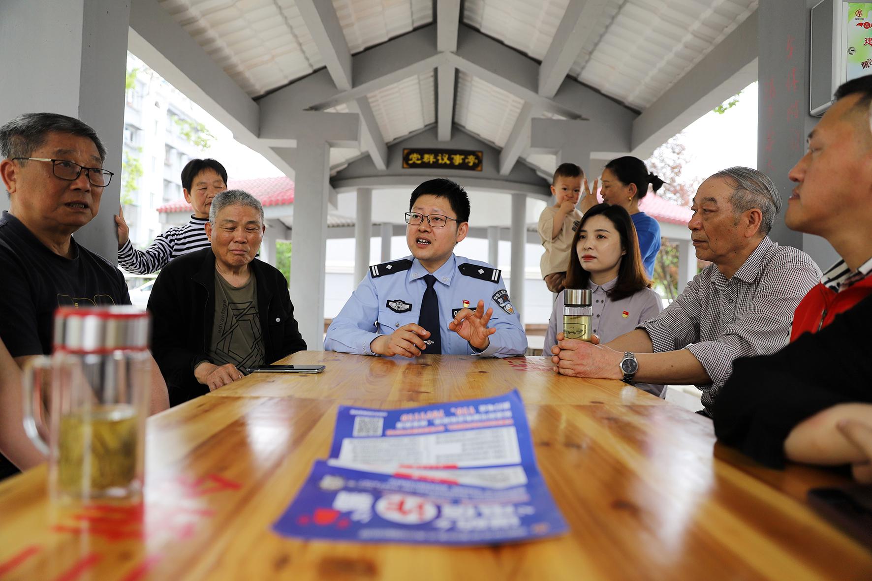 4月18日,安徽省蕪湖市公安局繁昌分局城關(guān)派出所民警在龍亭社區(qū)“小亭議事亭”,向市民了解治安狀況,共話平安建設(shè)。