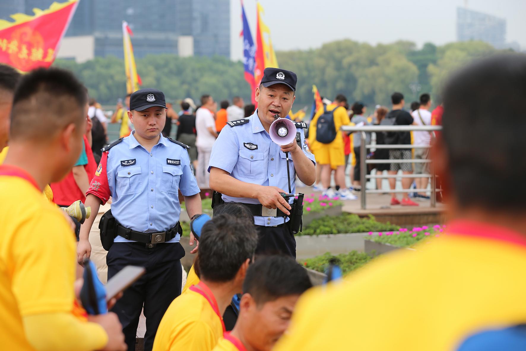 6月22日,安徽省合肥市天鵝湖舉行龍舟賽,現(xiàn)場執(zhí)勤民警拿著喇叭不時提醒群眾注意安全。