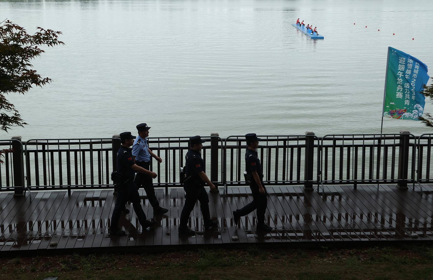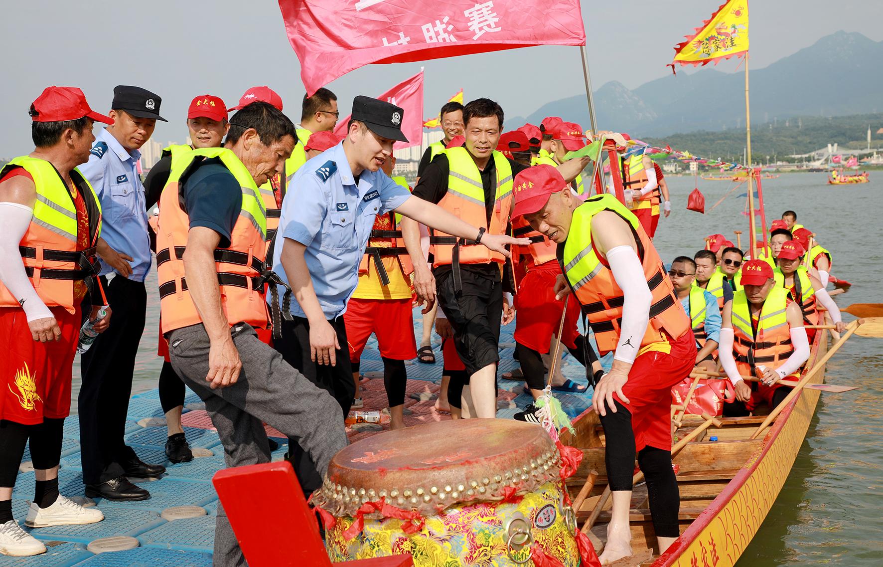 6月21日,江西省九江市公安局八里湖新區(qū)分局九龍派出所民輔警來到八里湖新區(qū)國際水上運(yùn)動中心開展專項(xiàng)檢查,提醒龍舟活動參與者切實(shí)提高安全意識。