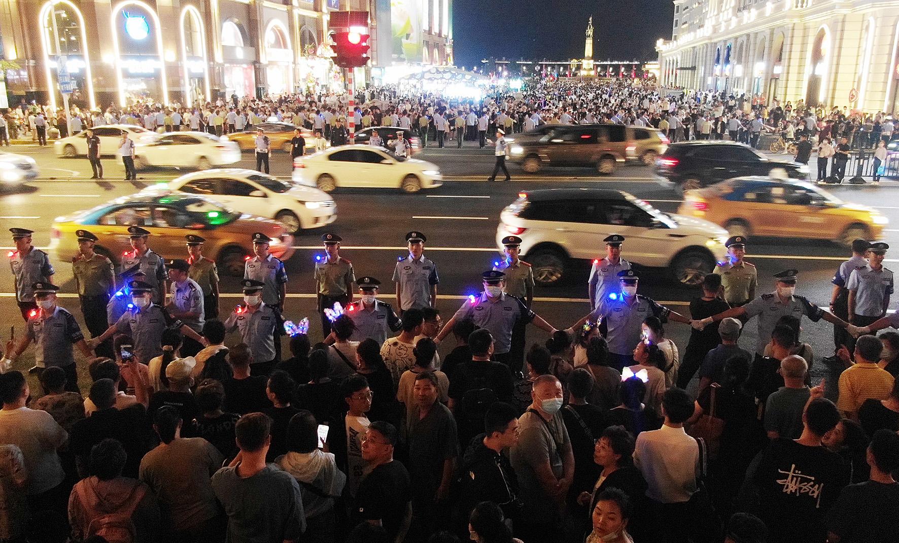 6月21日晚,在黑龍江省哈爾濱市友誼路和中央大街交叉路口,哈爾濱市公安局民警和武警黑龍江總隊哈爾濱支隊官兵聯(lián)合執(zhí)勤組成“人墻”,保障群眾安全通行。