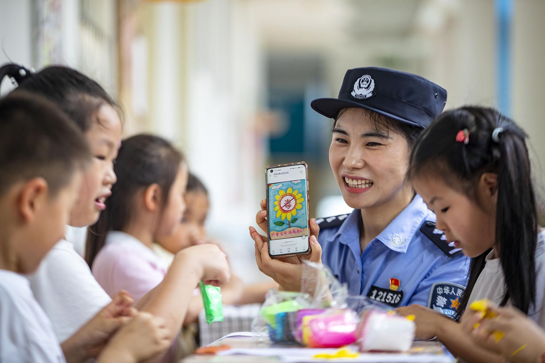 6月26日,江蘇省泰州市公安局海陵分局九龍派出所民警在幼兒園指導(dǎo)小朋友進(jìn)行“童心畫禁毒”活動。