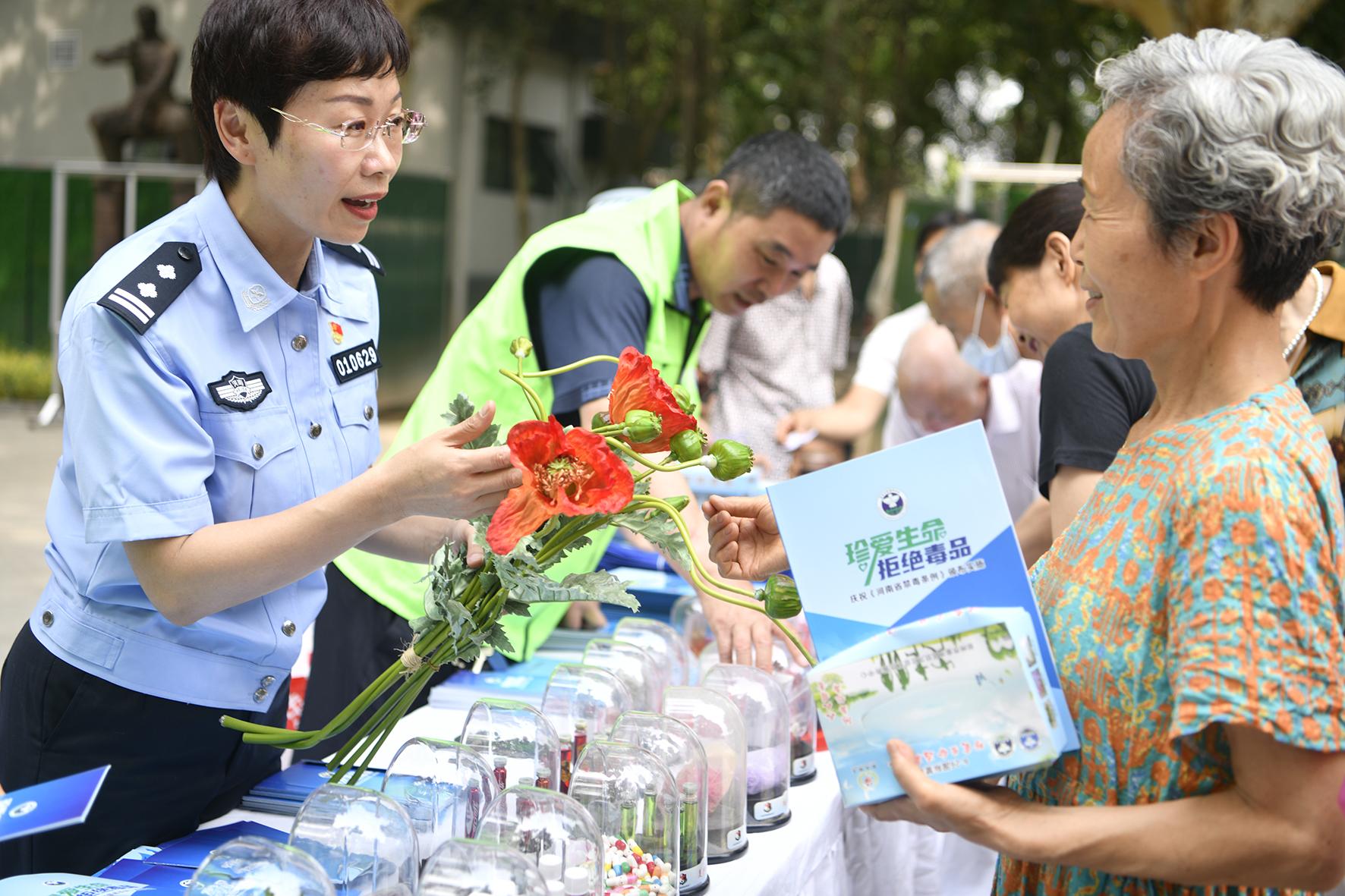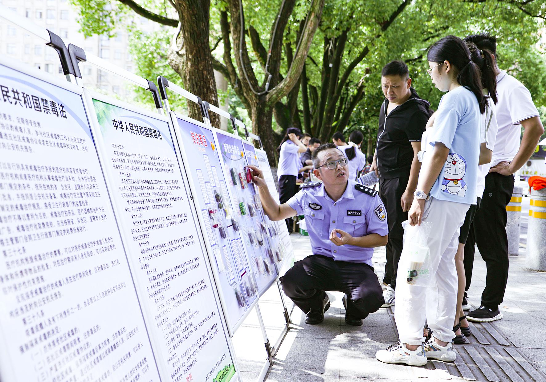 6月25日,河南省鄭州市公安局金水分局巡特警隊(duì)員與禁毒民警在文博廣場開展禁毒宣傳活動。