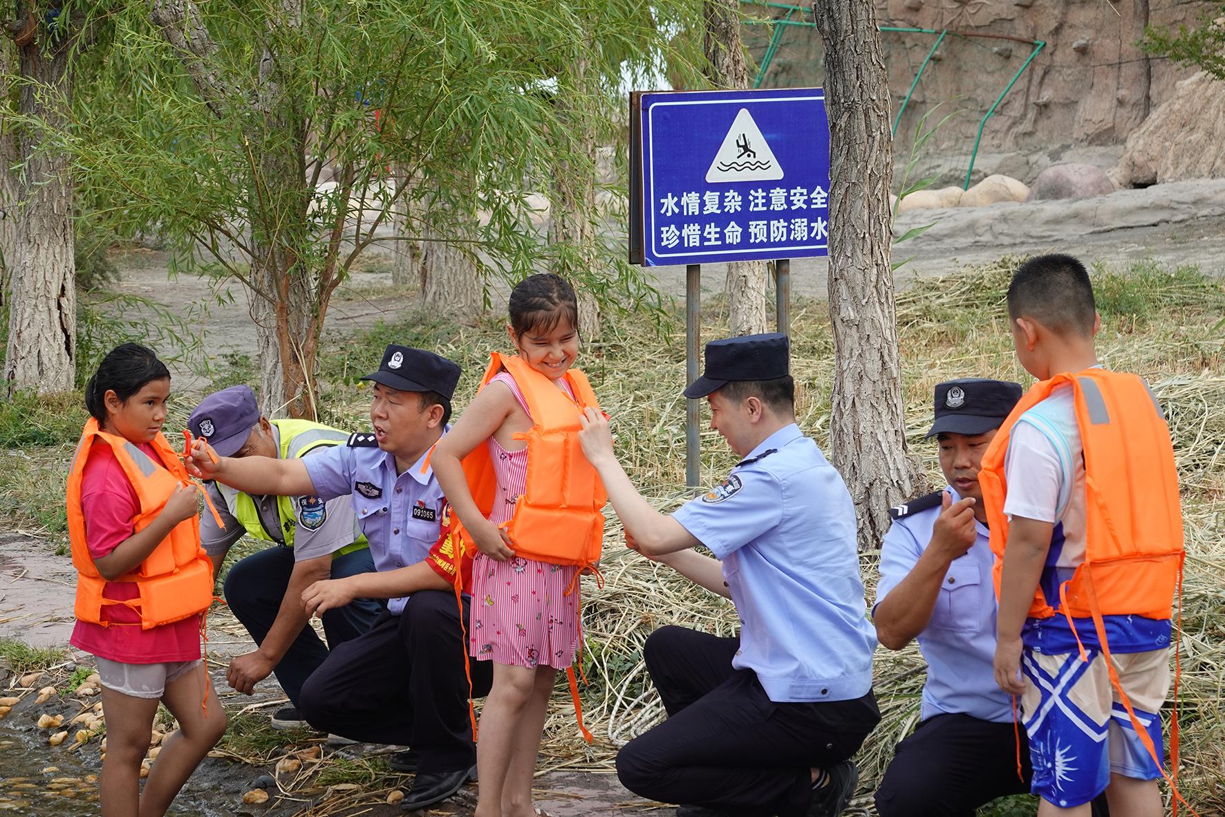 7月6日,新疆維吾爾自治區(qū)克拉瑪依市公安局白堿灘區(qū)分局白堿灘派出所民警在白沙灘旅游景區(qū)向小學(xué)生們講解如何正確使用救生衣和救生圈。