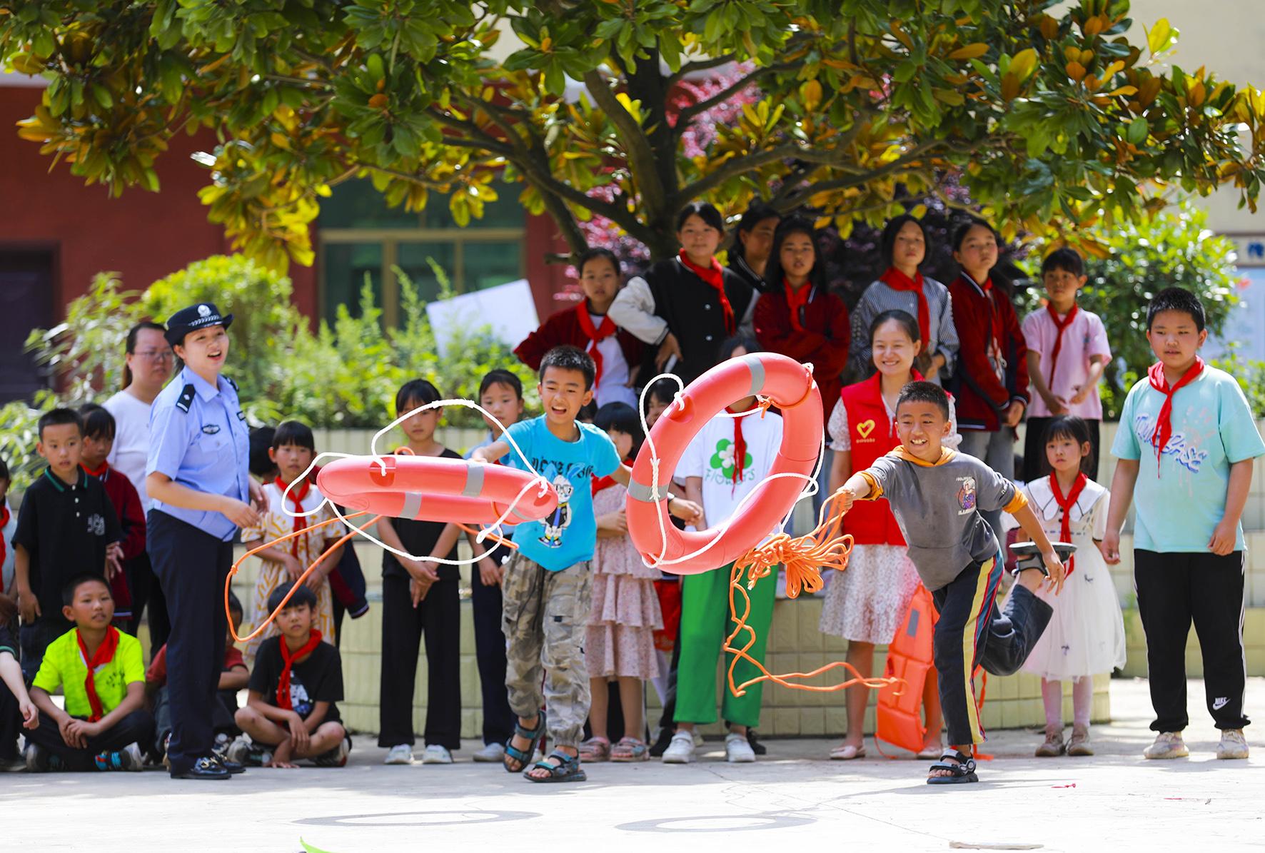 7月7日,在貴州省黔西市雨朵鎮(zhèn)沈場小學(xué),民警指導(dǎo)學(xué)生學(xué)習(xí)使用救生圈。暑假臨近,黔西市公安局雨朵派出所民警到轄區(qū)各所學(xué)校開展防溺水安全教育主題活動。