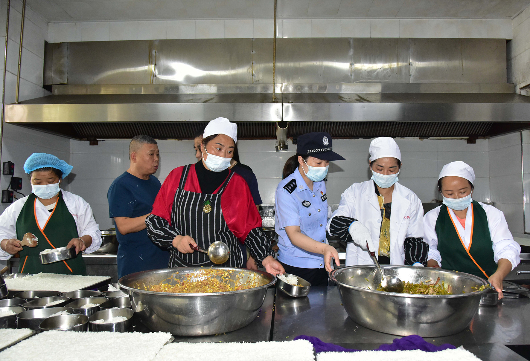 9月4日,安徽省當涂縣公安局護河派出所民警聯(lián)合市場監(jiān)督管理局工作人員檢查食堂食品安全情況。