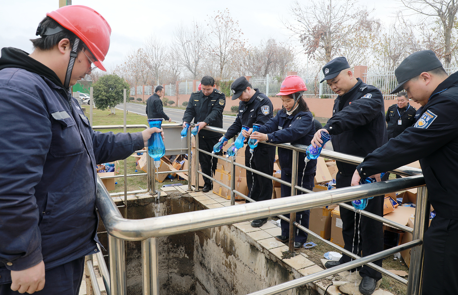 12月13日,江西省九江市公安局濂溪分局森林分局民警聯(lián)合市場監(jiān)管部門工作人員集中銷毀一批查獲的假酒。