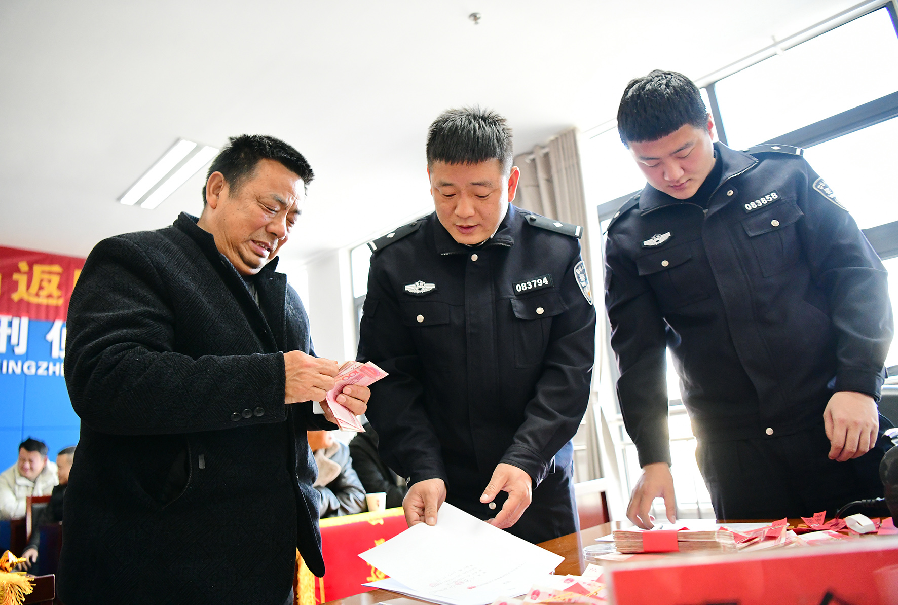 12月19日,安徽省阜南縣公安局舉行返還群眾被盜財物大會,現(xiàn)場發(fā)還群眾被盜現(xiàn)金、電動車、手機等財物。
