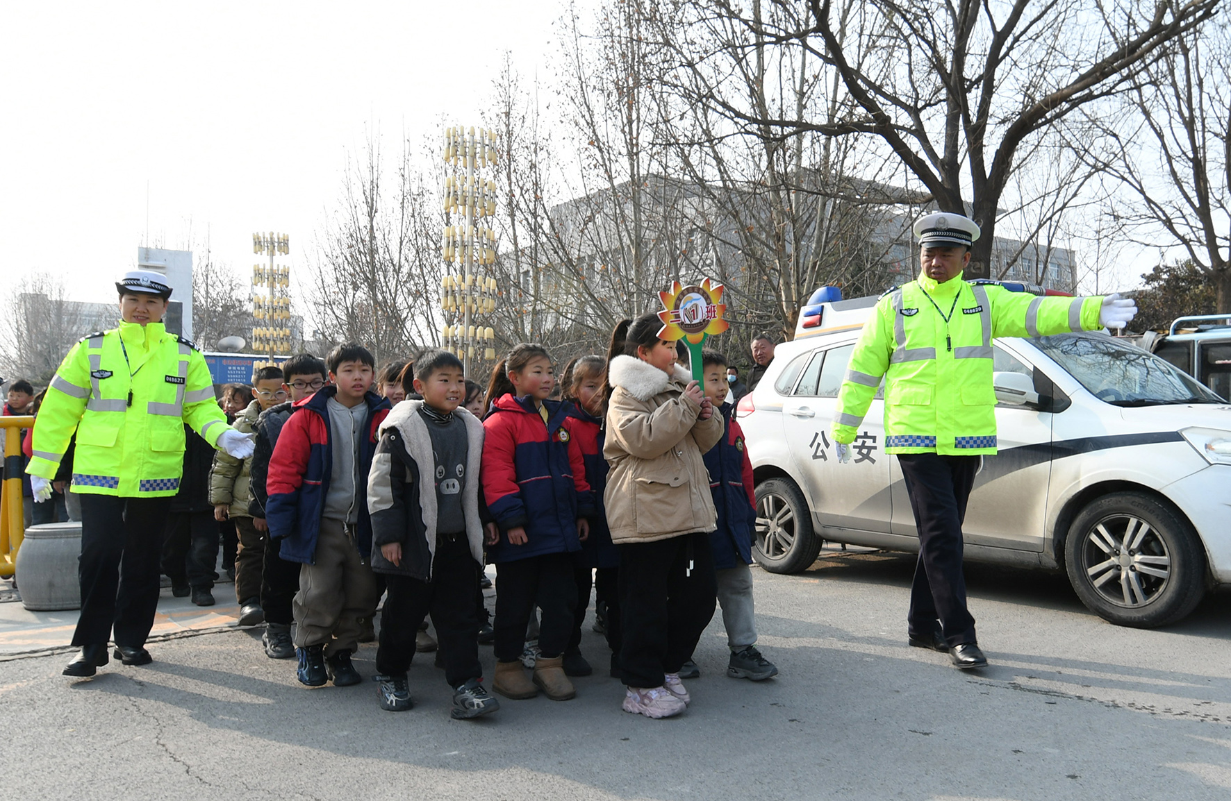 圖為12月27日,護(hù)學(xué)崗民警正在護(hù)送學(xué)生安全有序過(guò)馬路。