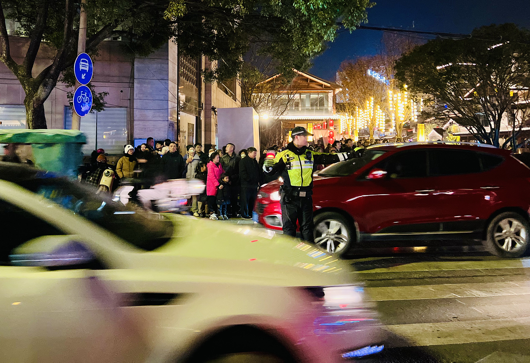圖為1月2日晚,民輔警在赤城街道工人西路指揮交通保暢通。