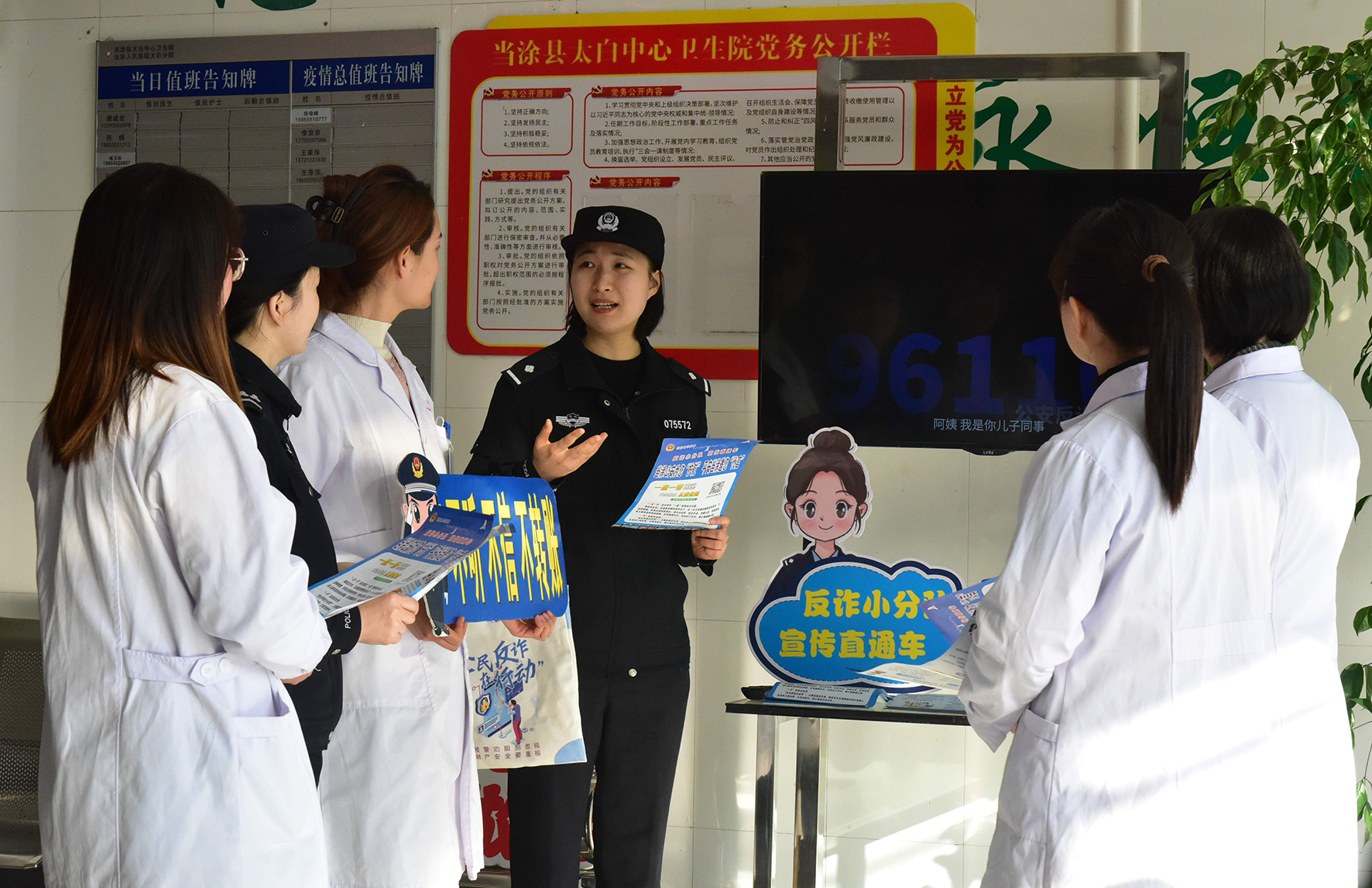 1月15日,安徽省當(dāng)涂縣公安局刑偵大隊反電詐中心民警聯(lián)合太白派出所民警來到太白中心衛(wèi)生院開展反電詐宣傳教育活動。