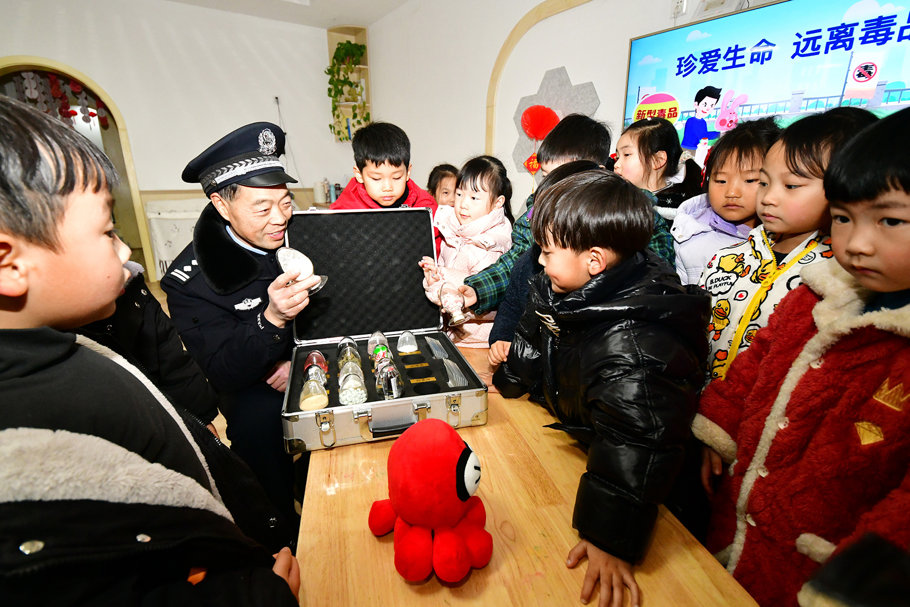 1月17日,安徽省阜南縣公安局城關(guān)派出所民警在鹿城幼兒園向孩子們講解如何辨別毒品。寒假臨近,阜南縣公安局城關(guān)派出所組織民輔警走進(jìn)轄區(qū)中小學(xué)校及幼兒園開(kāi)展“珍愛(ài)生命 遠(yuǎn)離毒品”宣傳活動(dòng)。