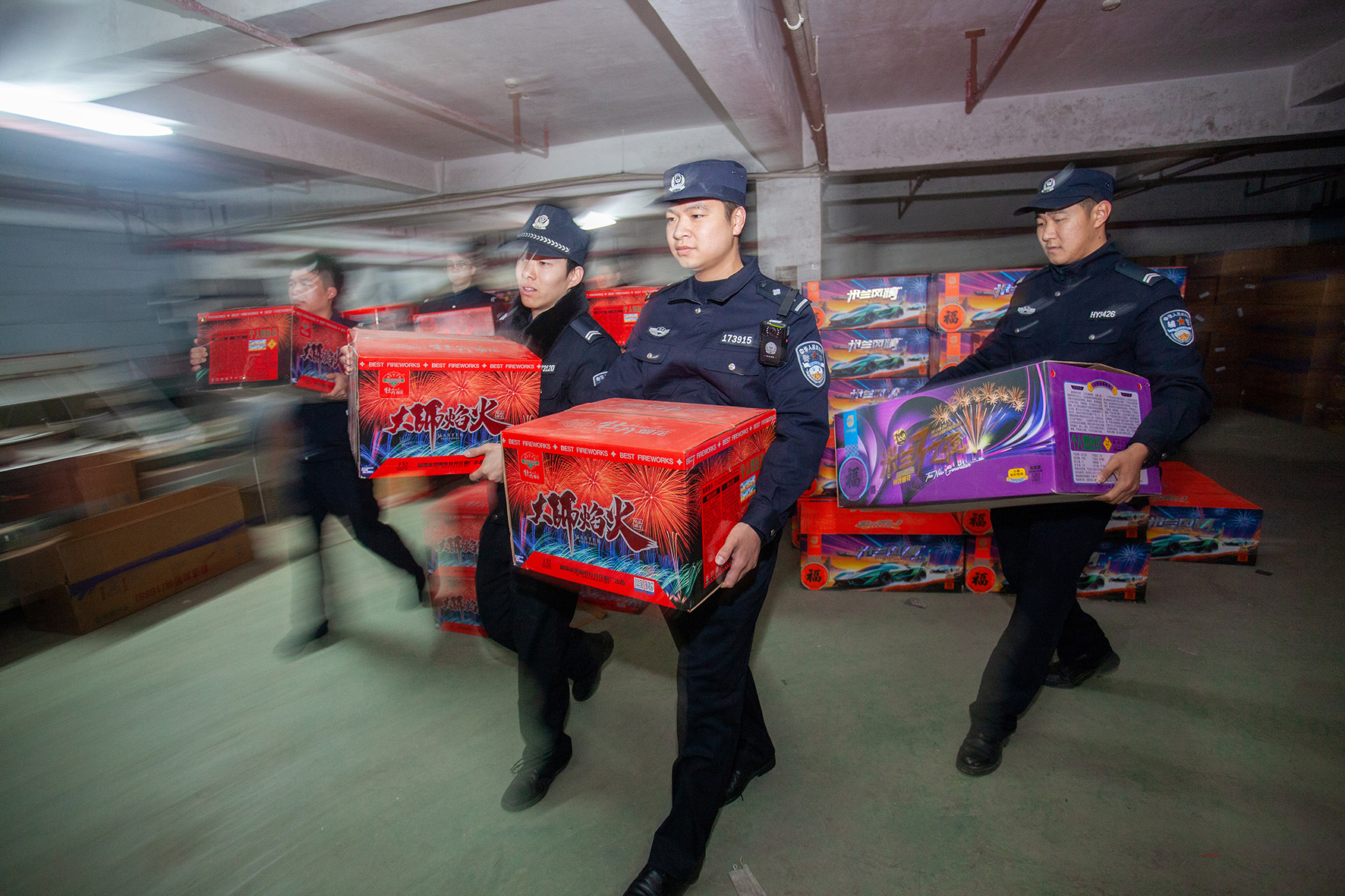 圖為2月2日,民警們對查獲的一個非法儲存煙花爆竹倉庫進行清點和轉移。