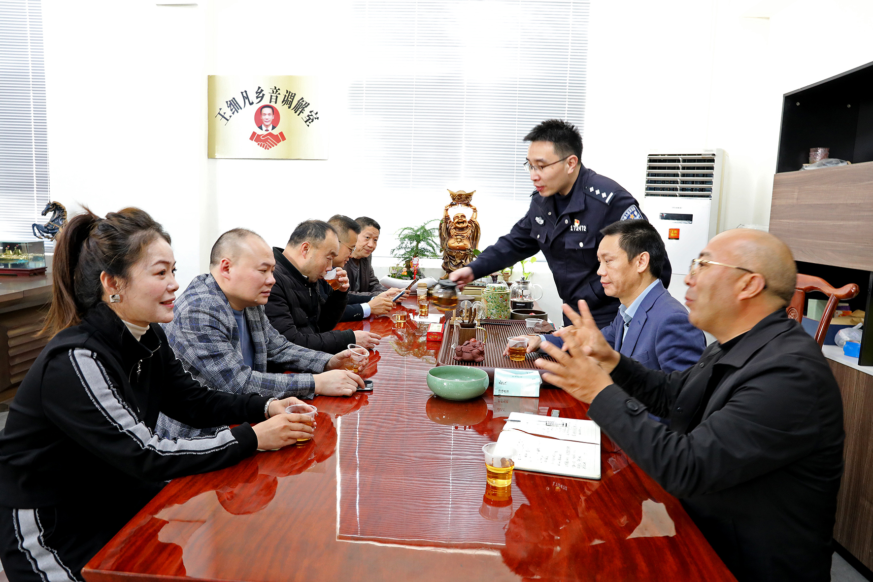 圖為3月19日,以王細凡個人命名的湖北籍鄉(xiāng)音調(diào)解室邀請杜橋派出所社區(qū)警務隊民警和專職調(diào)解員為“鄉(xiāng)音鄉(xiāng)情”調(diào)解員講解工作技巧。