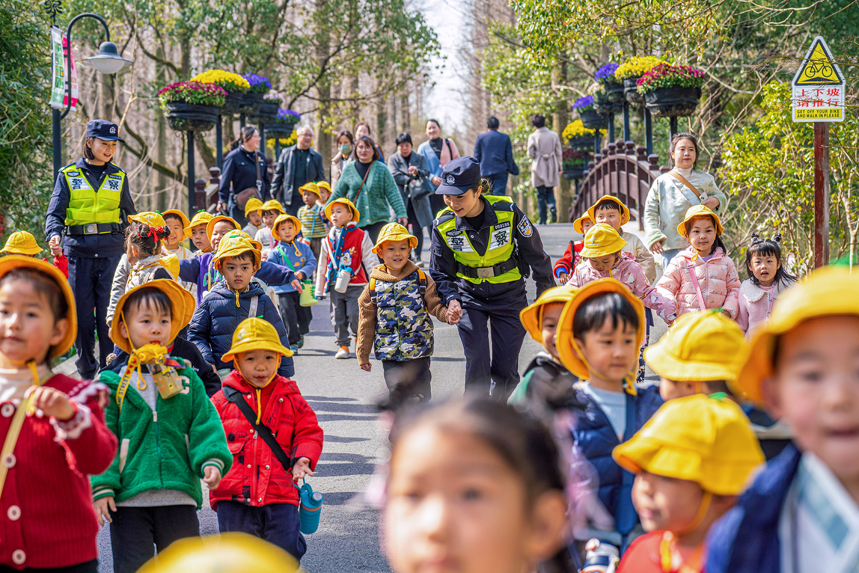 圖為民警為春游的小朋友們提供服務(wù)。