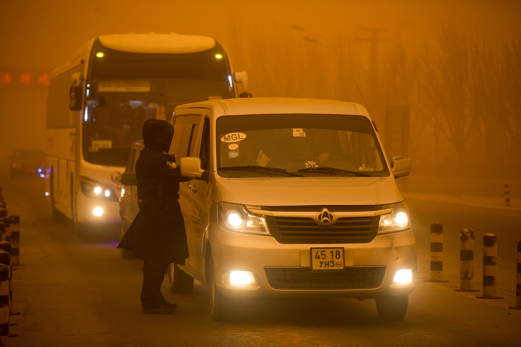 圖為移民管理警察頂著沙塵暴天氣快速驗(yàn)放通關(guān)車輛。