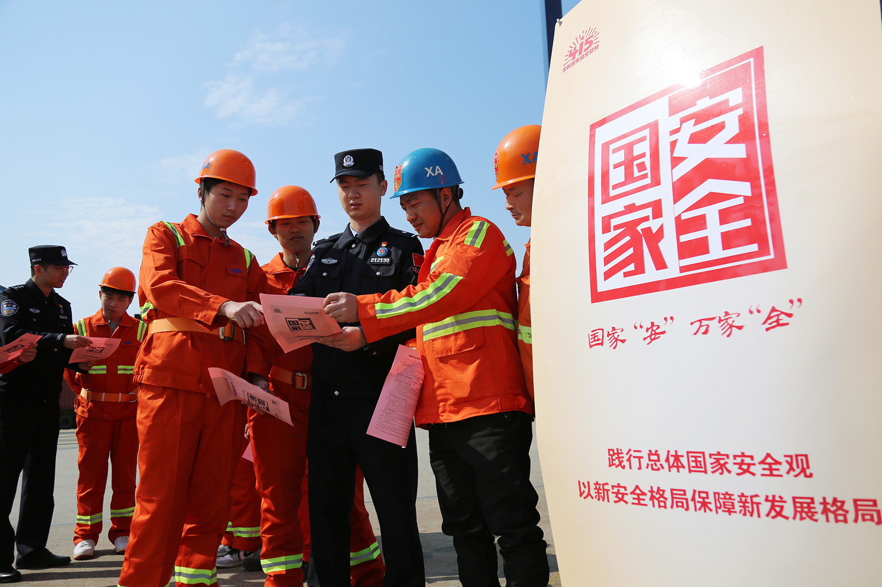 圖為4月10日,民警在大榭港區(qū)集裝箱碼頭開展國家安全教育。