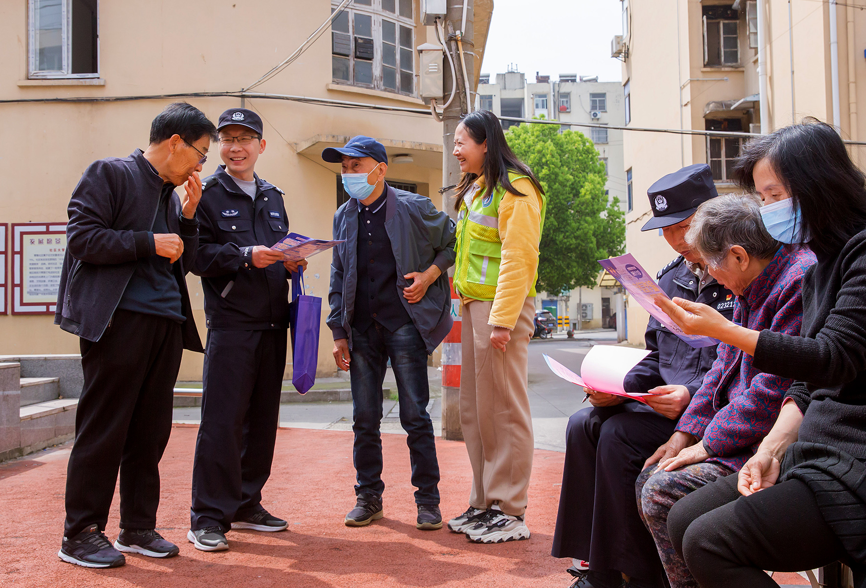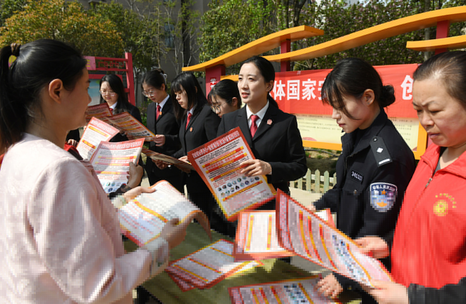 4月11日,山東省棗莊市公安局薛城分局鳳鳴湖派出所民輔警在轄區(qū)高樓社區(qū)全民國家安全教育日宣傳活動(dòng)。