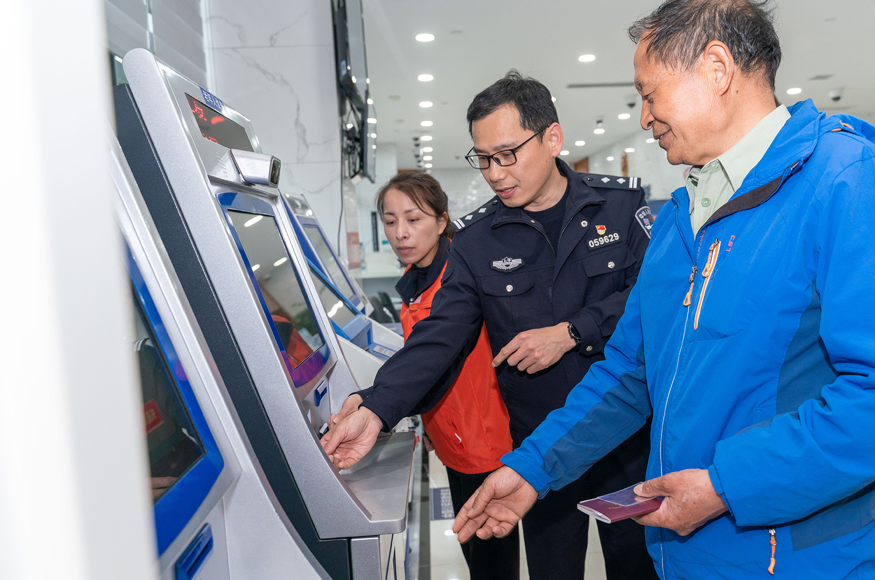 圖為4月17日,民警協(xié)助群眾通過自助簽注設備辦理業(yè)務。