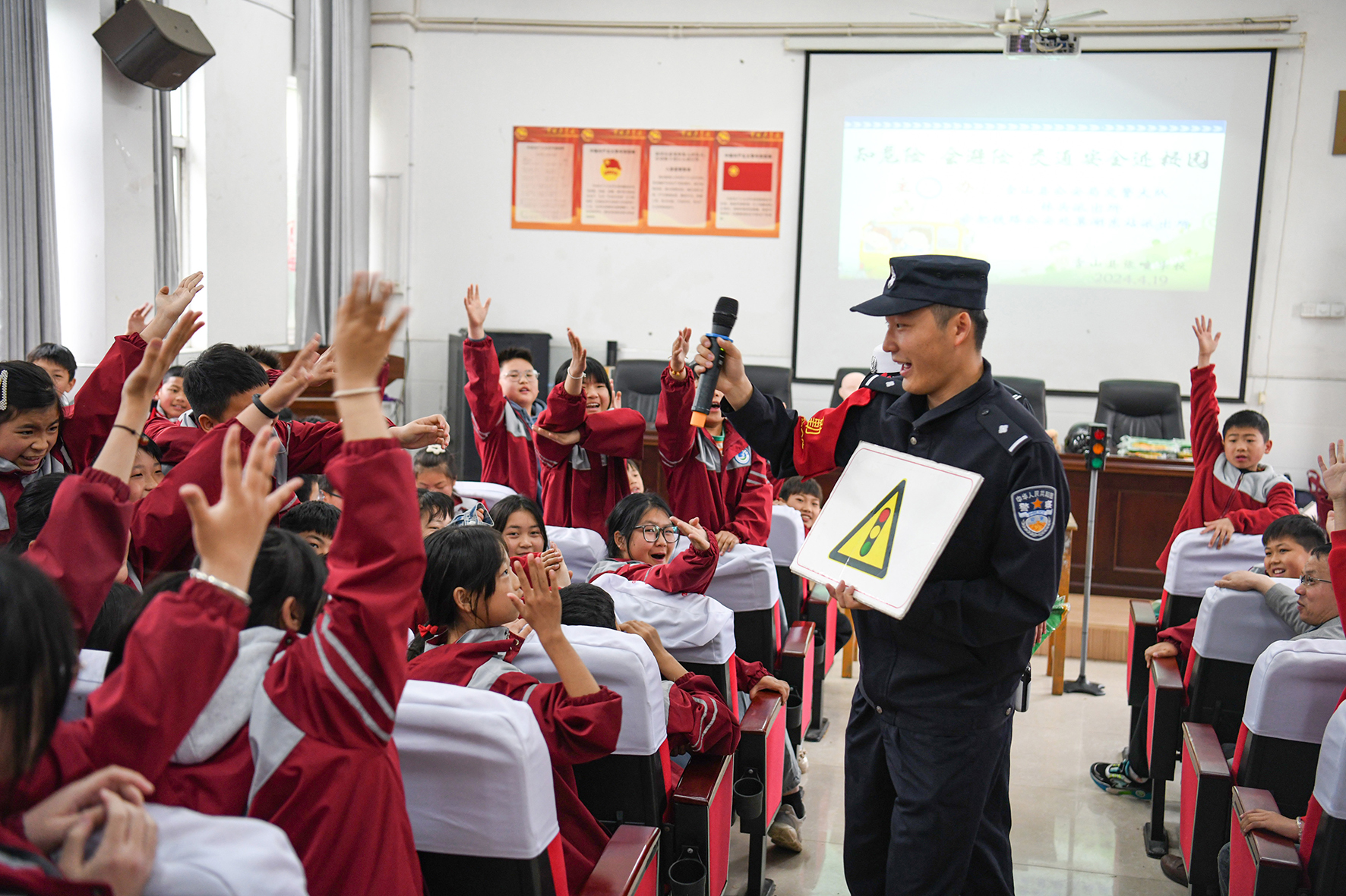 圖為同學(xué)們舉手搶答鐵路安全、道路交通安全、防火防盜防詐騙等知識問題。