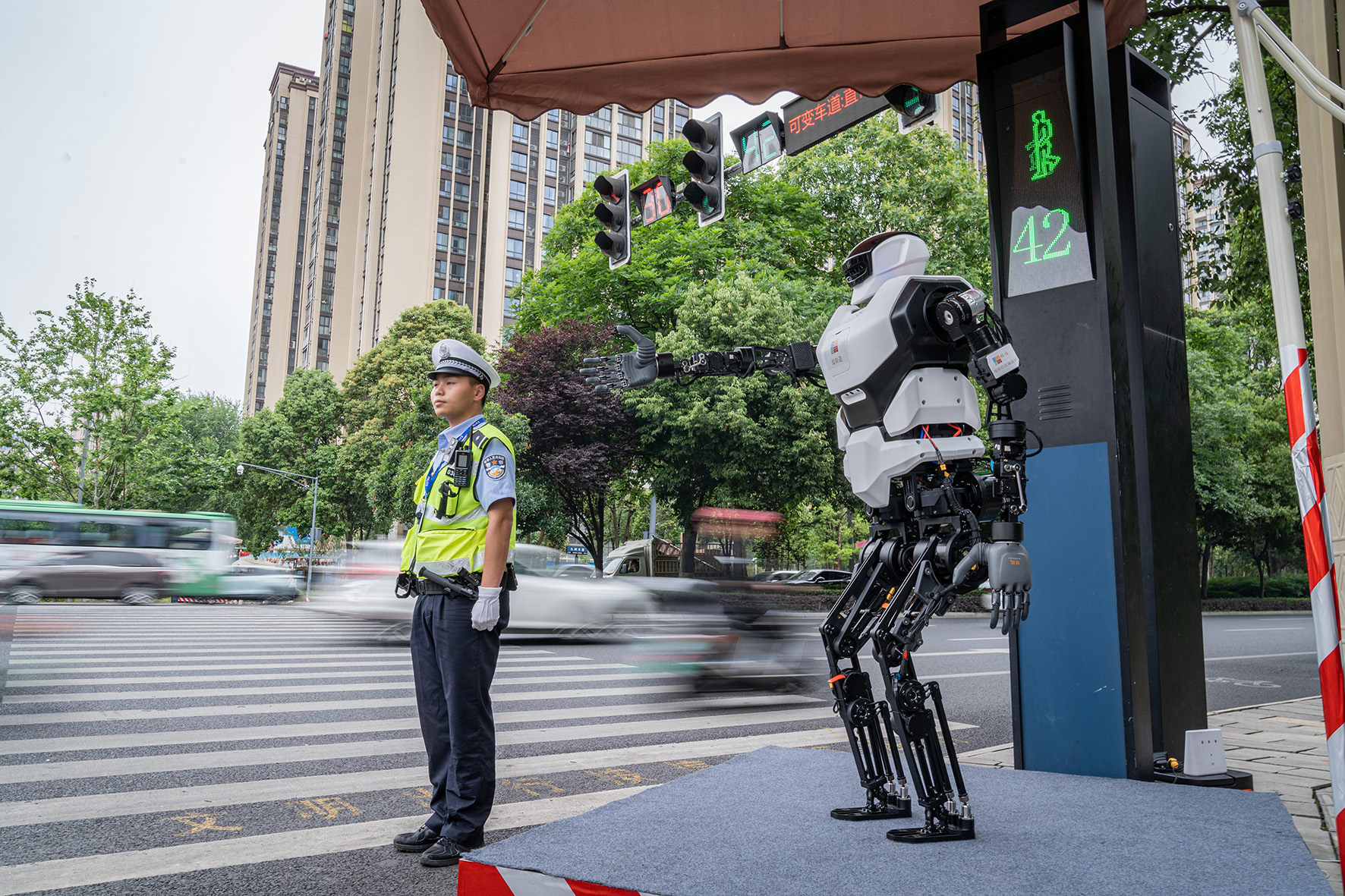 圖為5月11日,“綿陽(yáng)造”人形機(jī)器人在四川省綿陽(yáng)市科技城新區(qū)九洲大道與園藝街交叉路口,作為文明交通勸導(dǎo)“志愿者”配合民警開(kāi)展工作。