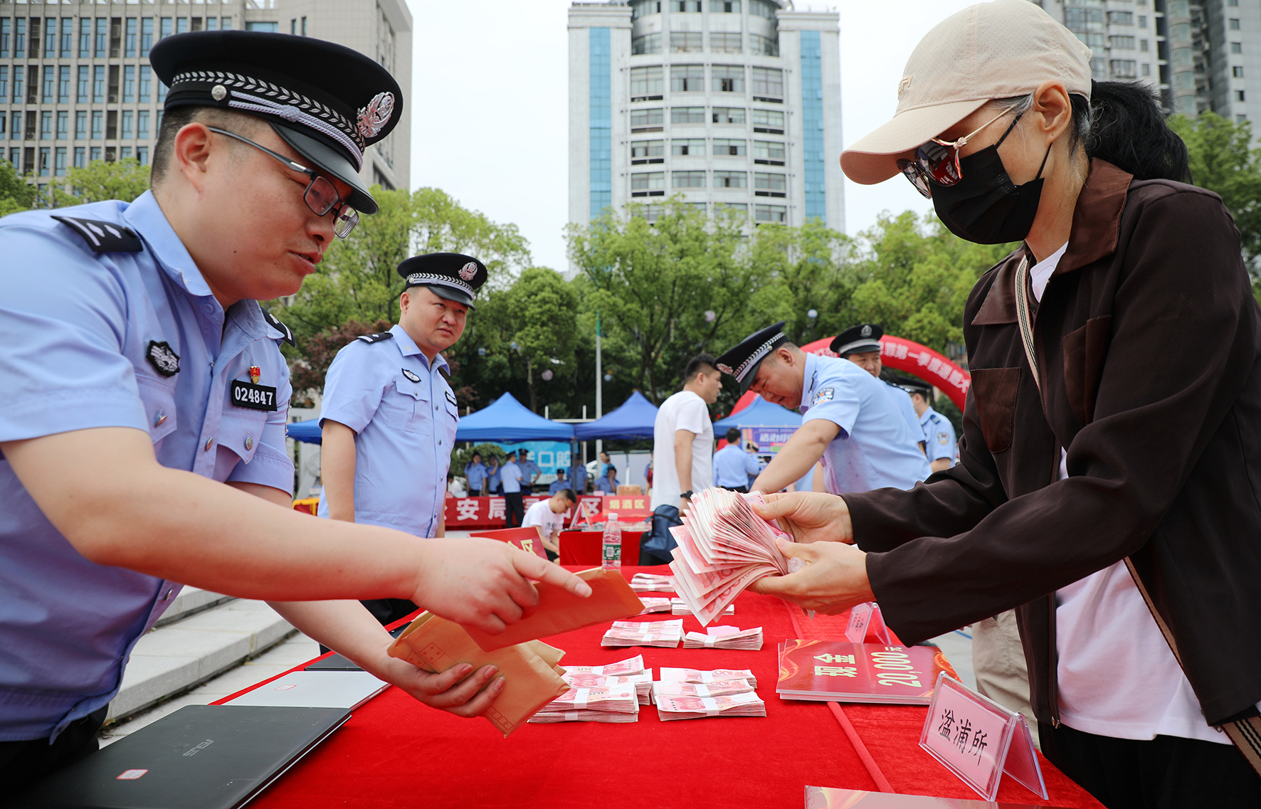 5月20日,江西省九江市公安局潯陽(yáng)分局舉行涉案財(cái)物集中發(fā)還活動(dòng),將在近期繳獲的涉案財(cái)物發(fā)還給群眾。