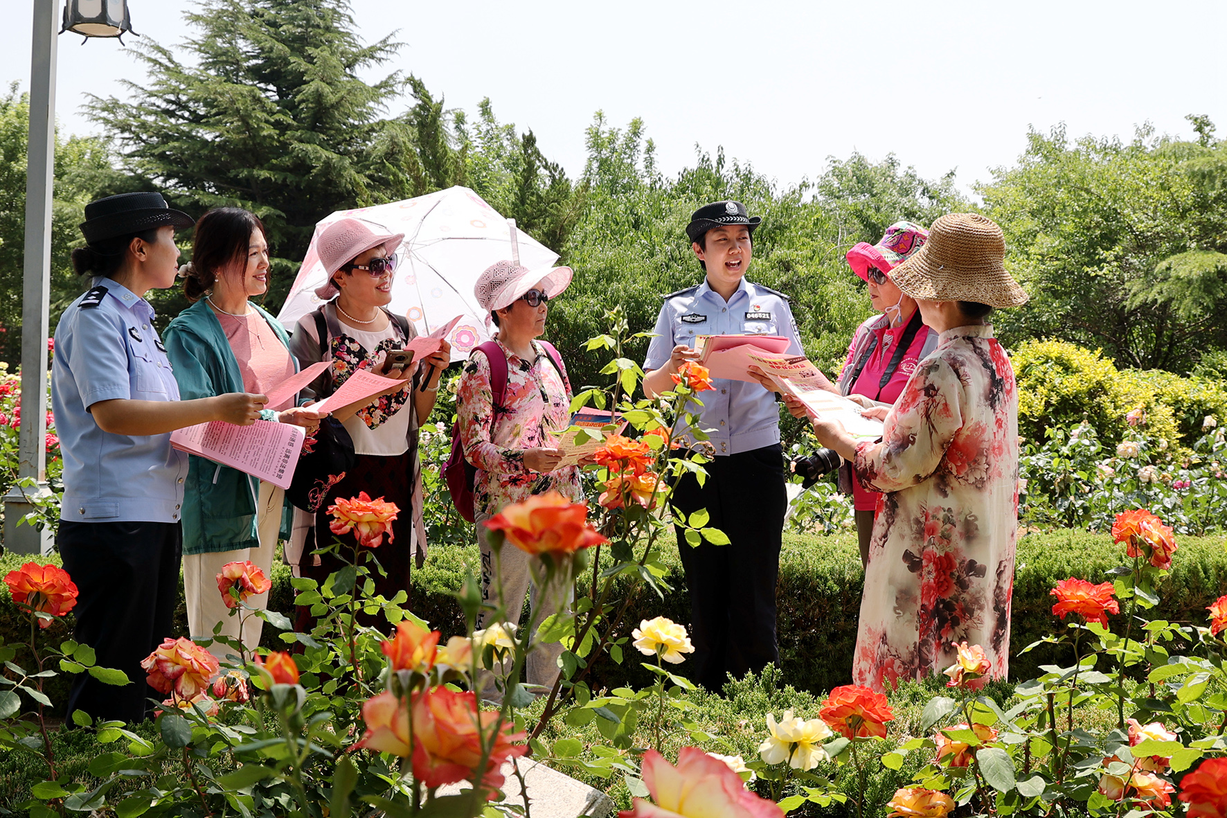 5月22日,山東省萊州市公安局經偵大隊民警在中華月季園中為賞花游玩的群眾講解識別非法集資犯罪方法。