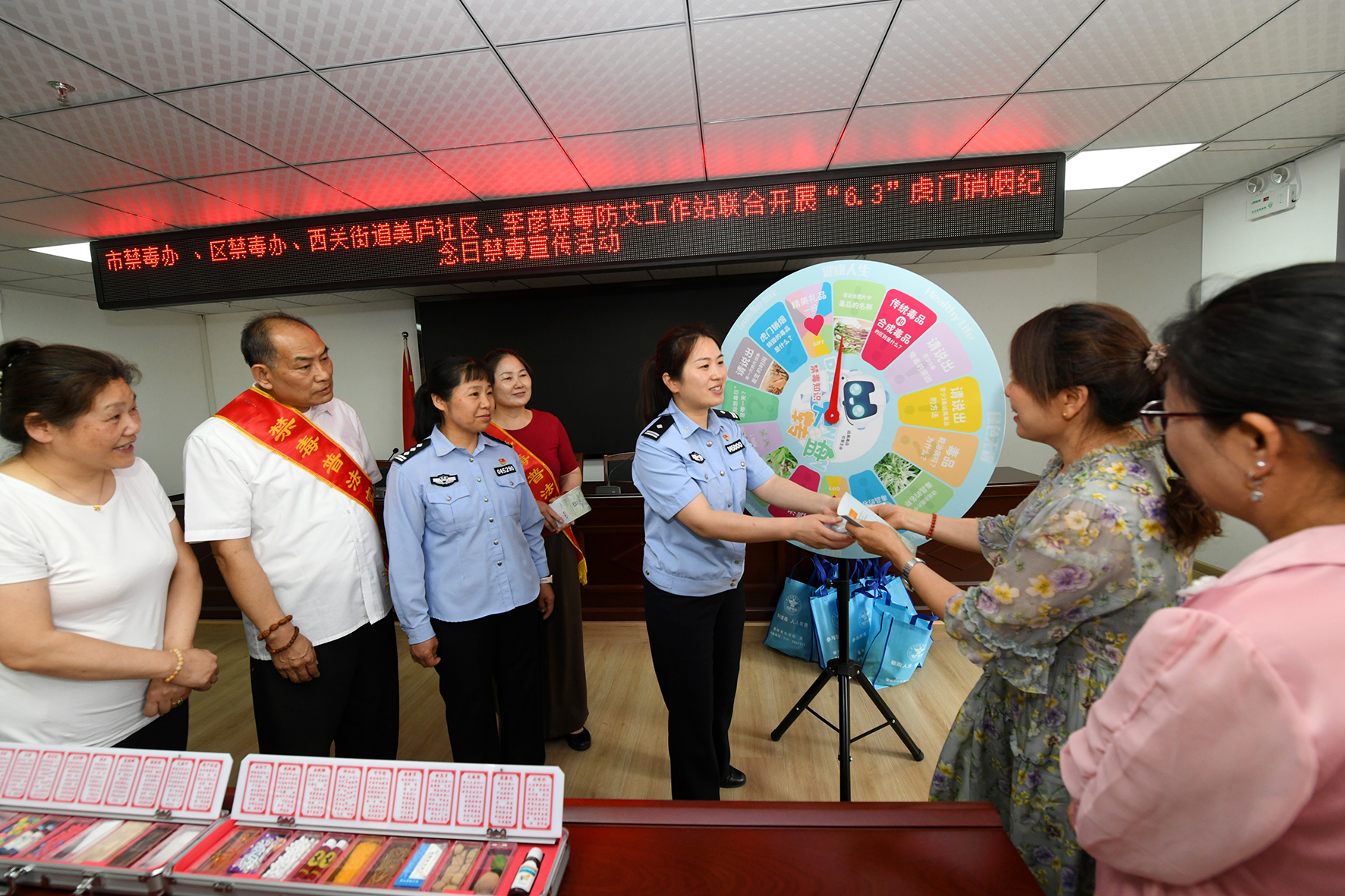 6月3日,安徽宿州市埇橋區(qū)西關(guān)街道美廬社區(qū),民警、禁毒志愿者和居民共同參與“大轉(zhuǎn)盤”禁毒游戲。當(dāng)日,是虎門銷煙185周年紀(jì)念日。宿州市公安局禁毒辦、埇橋公安分局禁毒辦、西關(guān)街道、李彥防艾禁毒工作站聯(lián)合開展“遠離毒品 無毒社區(qū)”禁毒普法宣傳活動,通過“大轉(zhuǎn)盤”游戲、播放短視頻、發(fā)放禁毒宣傳彩頁、講解新型毒品特點與危害,提升廣大社區(qū)居民識毒、防毒、拒毒意識,自覺抵制毒品侵害。