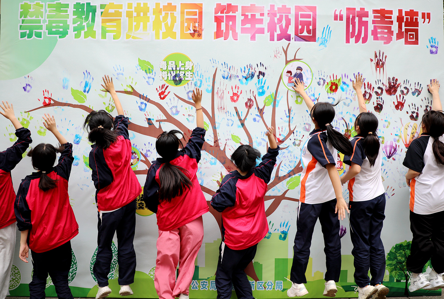 圖為學(xué)生們?cè)谥黝}宣傳墻上按手印。