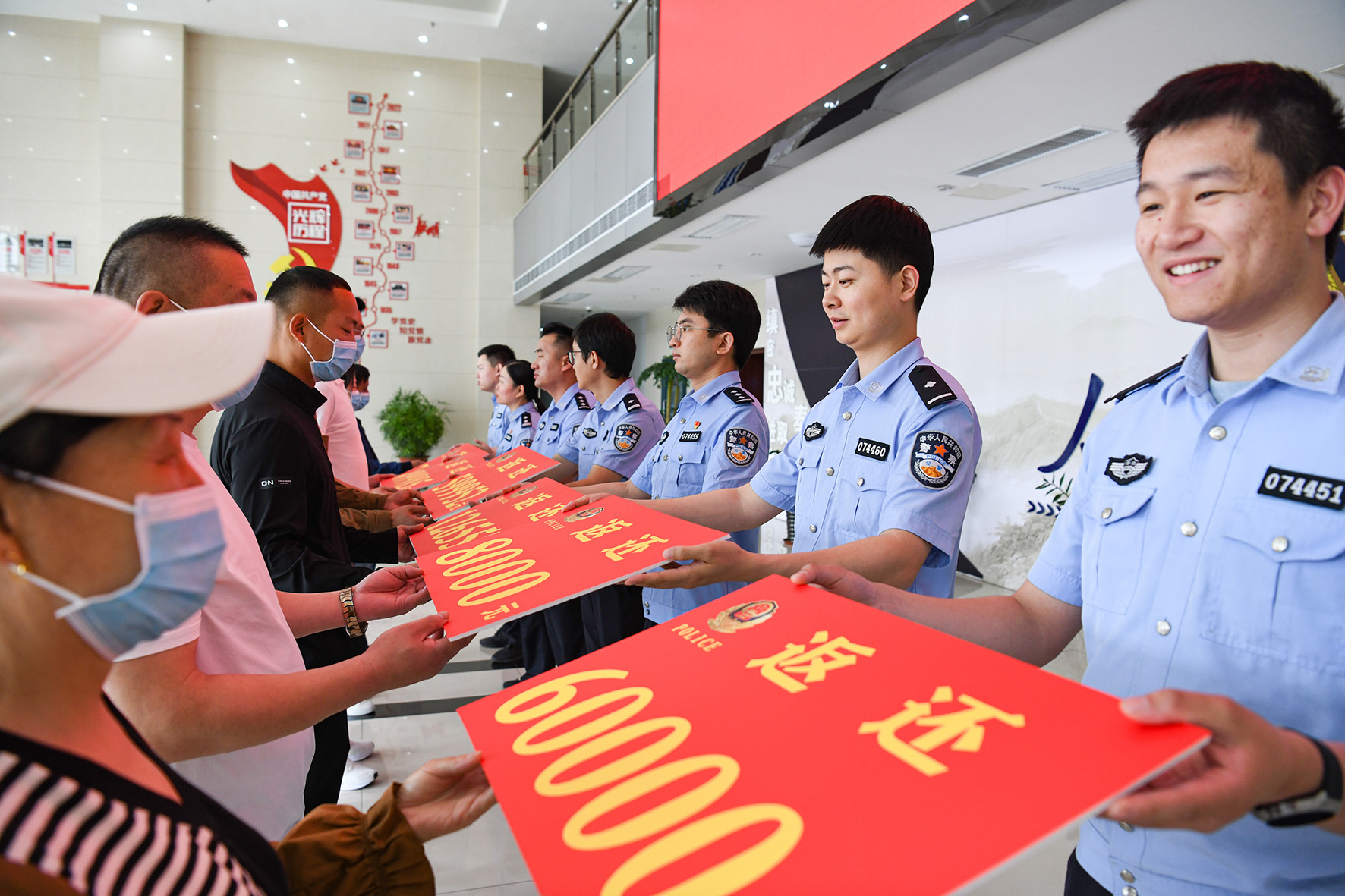 6月6日,安徽省馬鞍山市含山縣公安局刑偵大隊(duì)舉行被盜被騙財(cái)物返還儀式,將追回的135余萬涉案錢款返還給群眾。