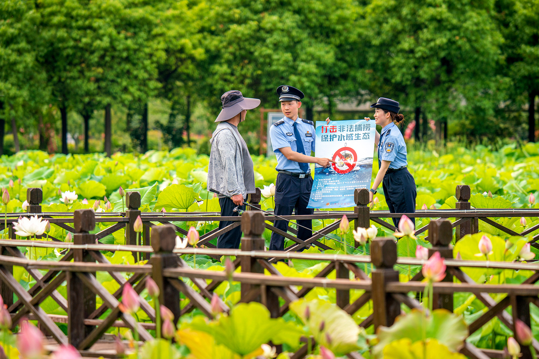 6月13日,上海市公安局崇明分局綠華派出所民警來到轄區(qū)荷花公園,向園內(nèi)垂釣的群眾開展水域生態(tài)保護(hù)的釋法說理,提醒垂釣群眾不可以使用“一人多桿、一線多鉤、多線多鉤”的方式開展垂釣,共同保護(hù)好轄區(qū)的水域生態(tài)。
