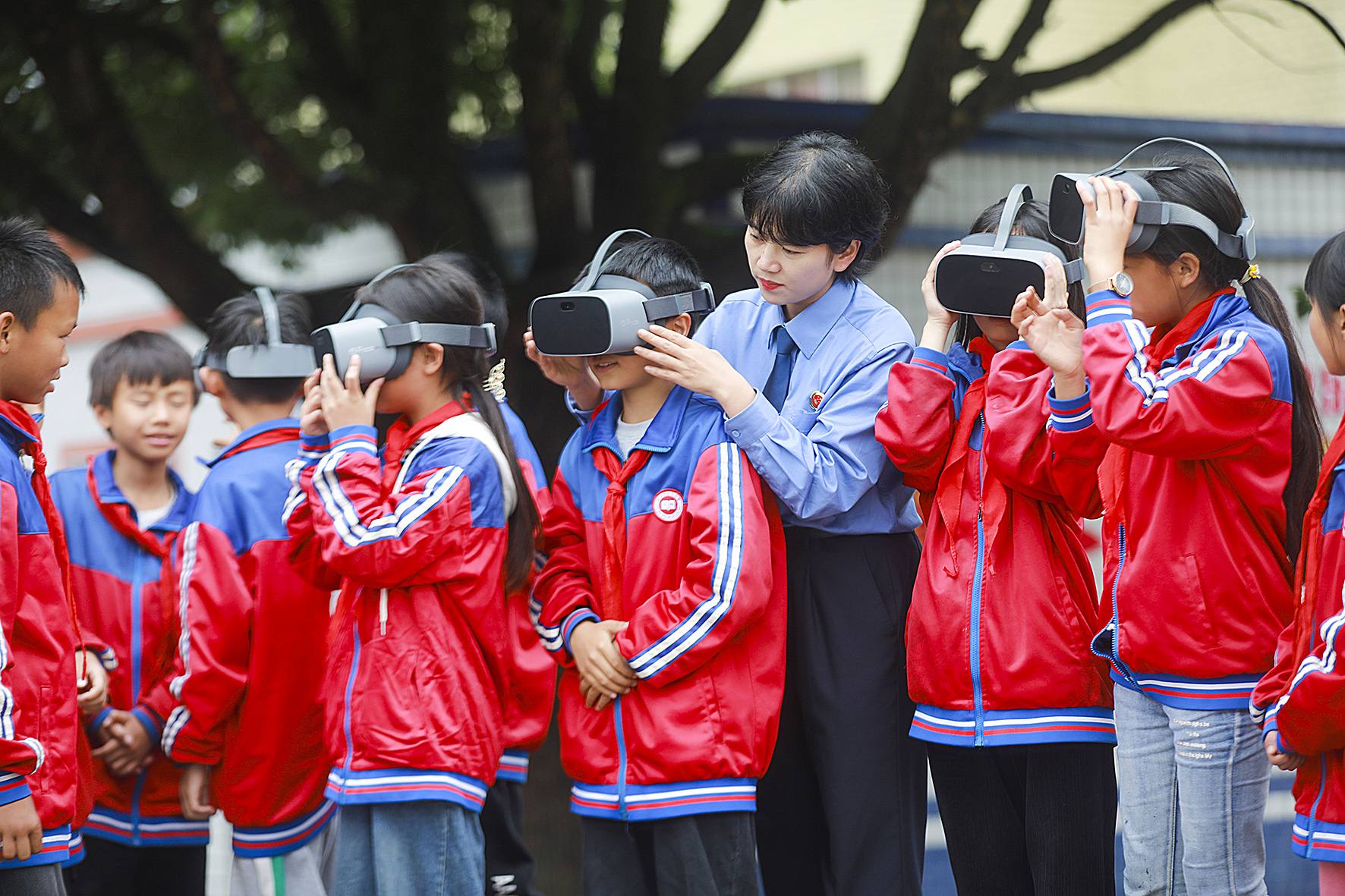 圖為檢察官指導(dǎo)學(xué)生利用VR眼鏡體驗(yàn)毒品的危害。