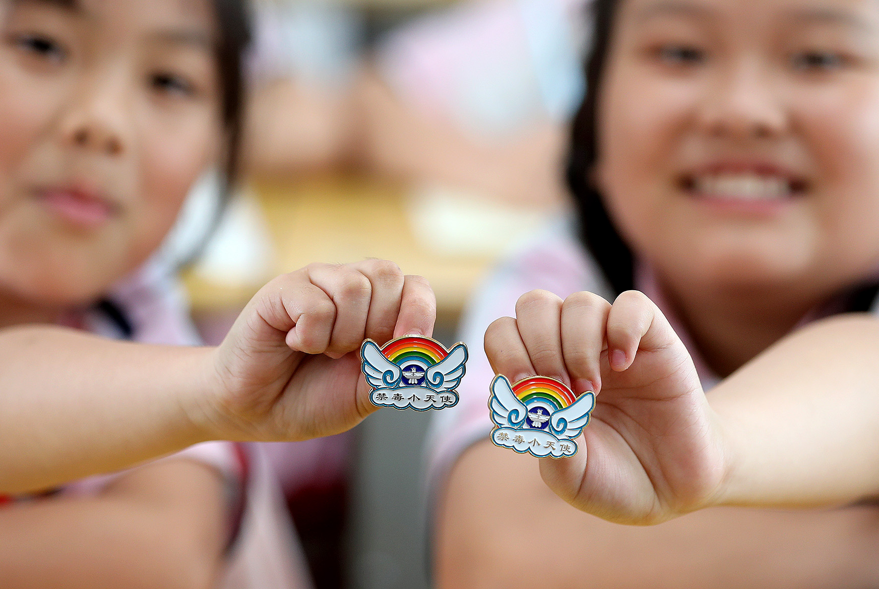 6月18日,湖北省沙洋縣公安局民警在洪嶺小學(xué),為30名同學(xué)佩戴“禁毒小天使”徽章,并帶領(lǐng)“禁毒小天使”在校園,向同學(xué)們宣傳禁毒知識(shí),傳遞正能量。