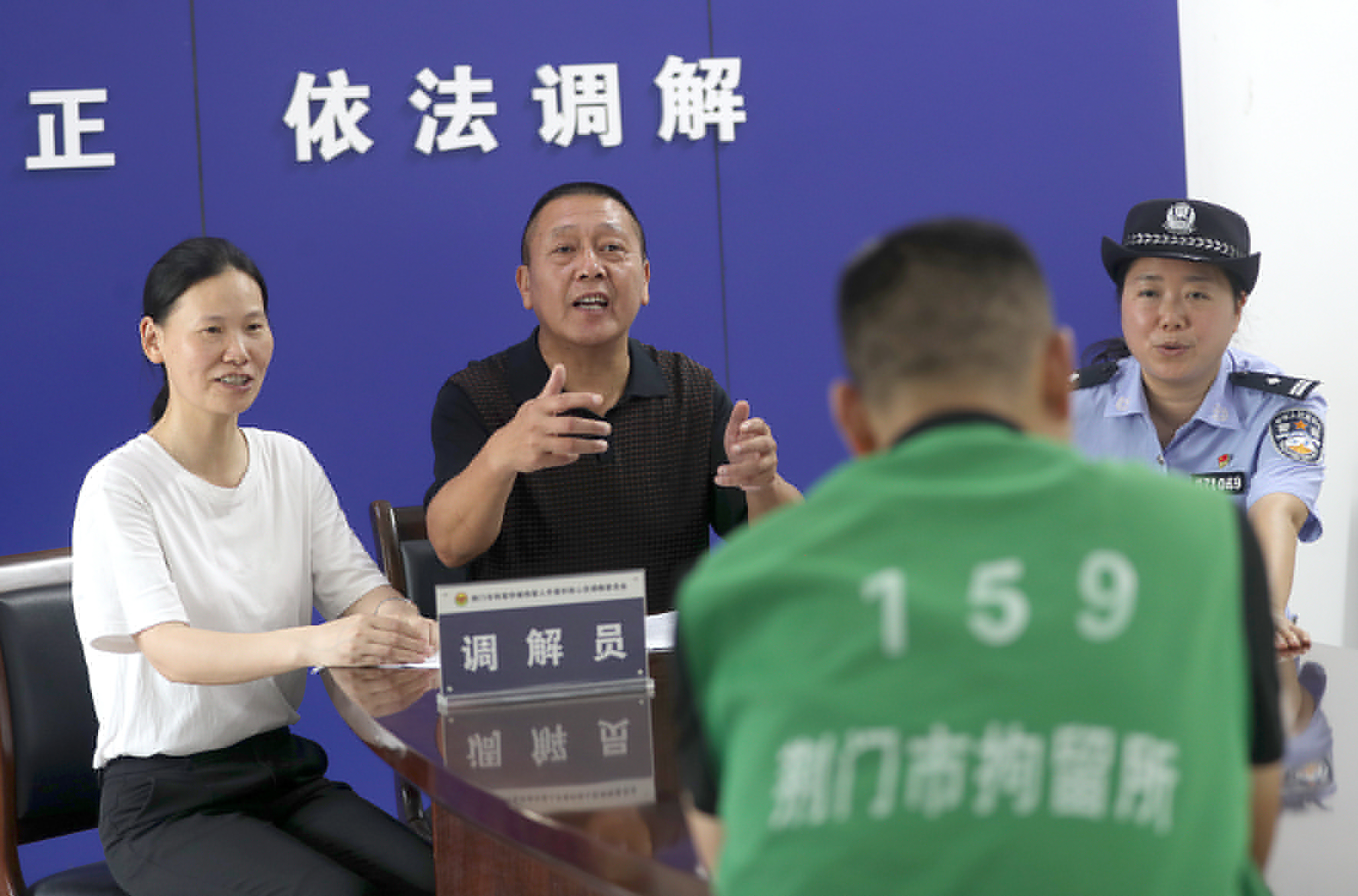 圖二:7月8日,在荊門市拘留所,人民調(diào)解員、執(zhí)行法官和律師通過(guò)“聯(lián)動(dòng)調(diào)解”,督促“老賴”履行相關(guān)義務(wù)。