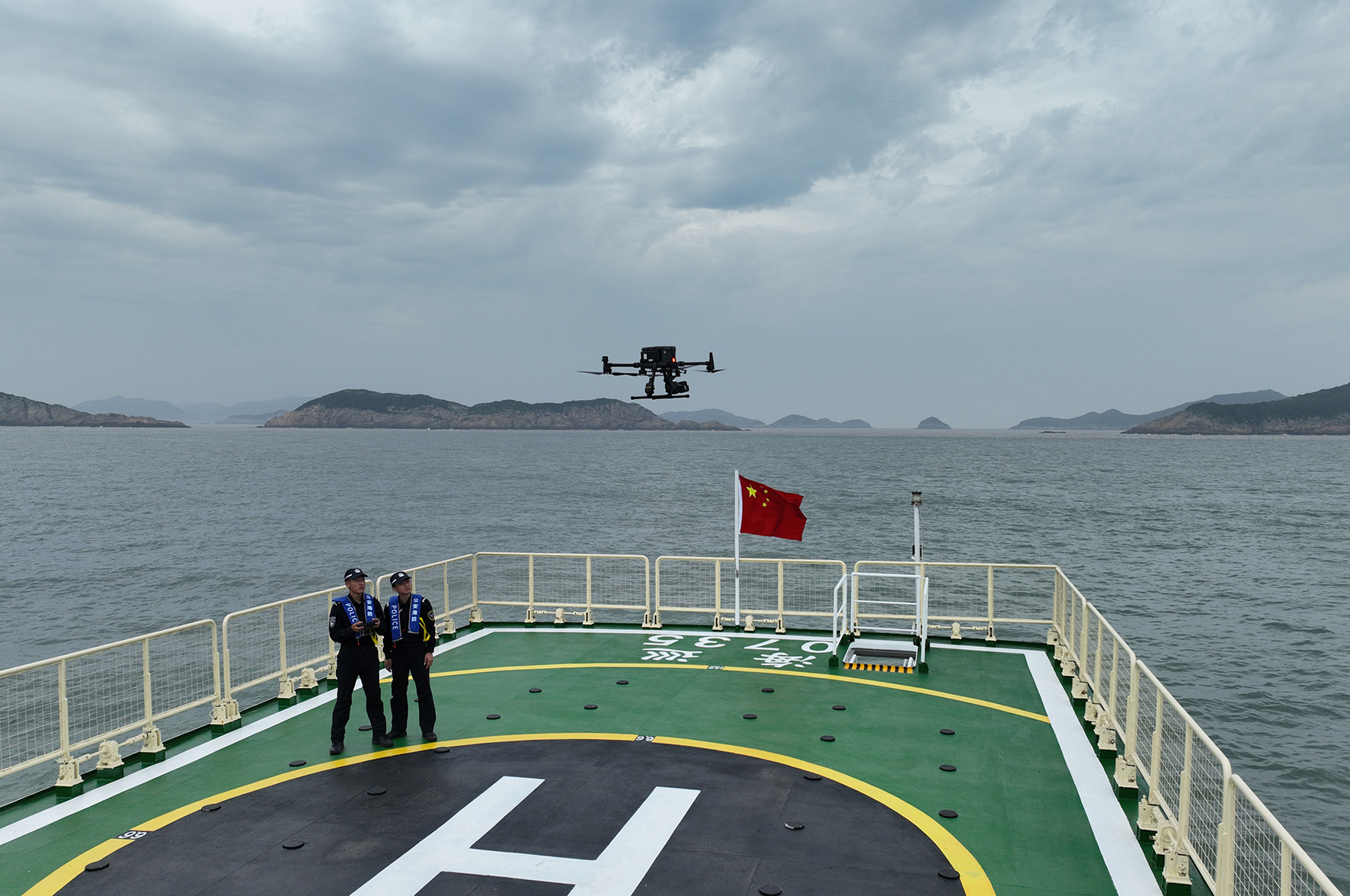 圖為岱山縣公安局魚(yú)鷹戰(zhàn)隊(duì)利用無(wú)人機(jī)對(duì)無(wú)人島進(jìn)行巡查。
