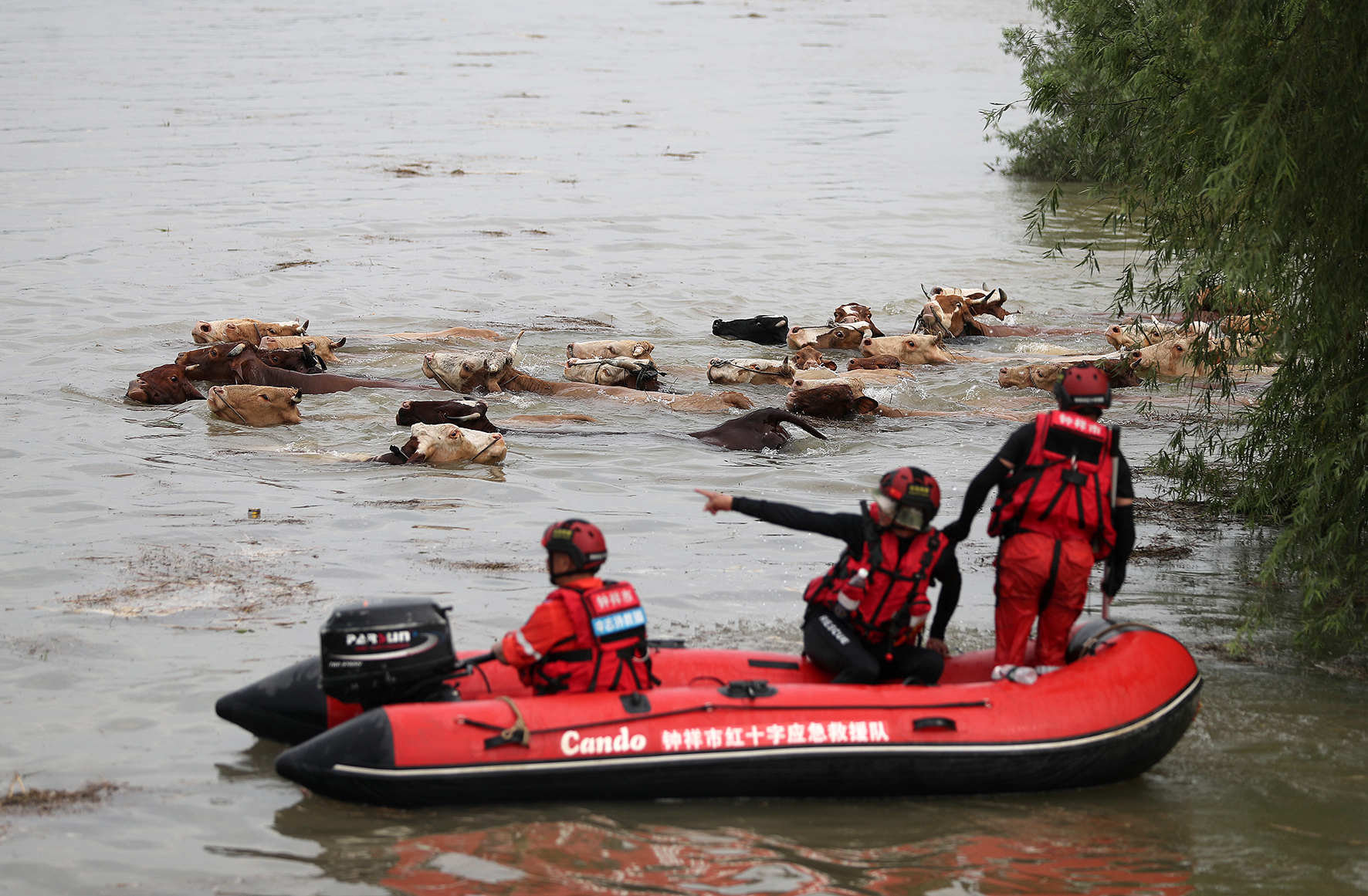 7月15日,受降雨及上游泄洪影響,漢江湖北省鐘祥柴湖段水位持續(xù)上漲,鐘祥市柴湖鎮(zhèn)中心集村村民肖春華散養(yǎng)在漢江江灘的42頭黃牛被江水圍困,隨時有被大水沖走的危險。危急時刻,鐘祥市公安局迅速組織柴湖派出所、中志協(xié)應(yīng)急救援隊、莫愁義警趕往現(xiàn)場實施救援。救援人員通過皮劃艇后方驅(qū)趕、前方涉水引導(dǎo)等方式將被圍困的牛群全部成功營救上岸。
