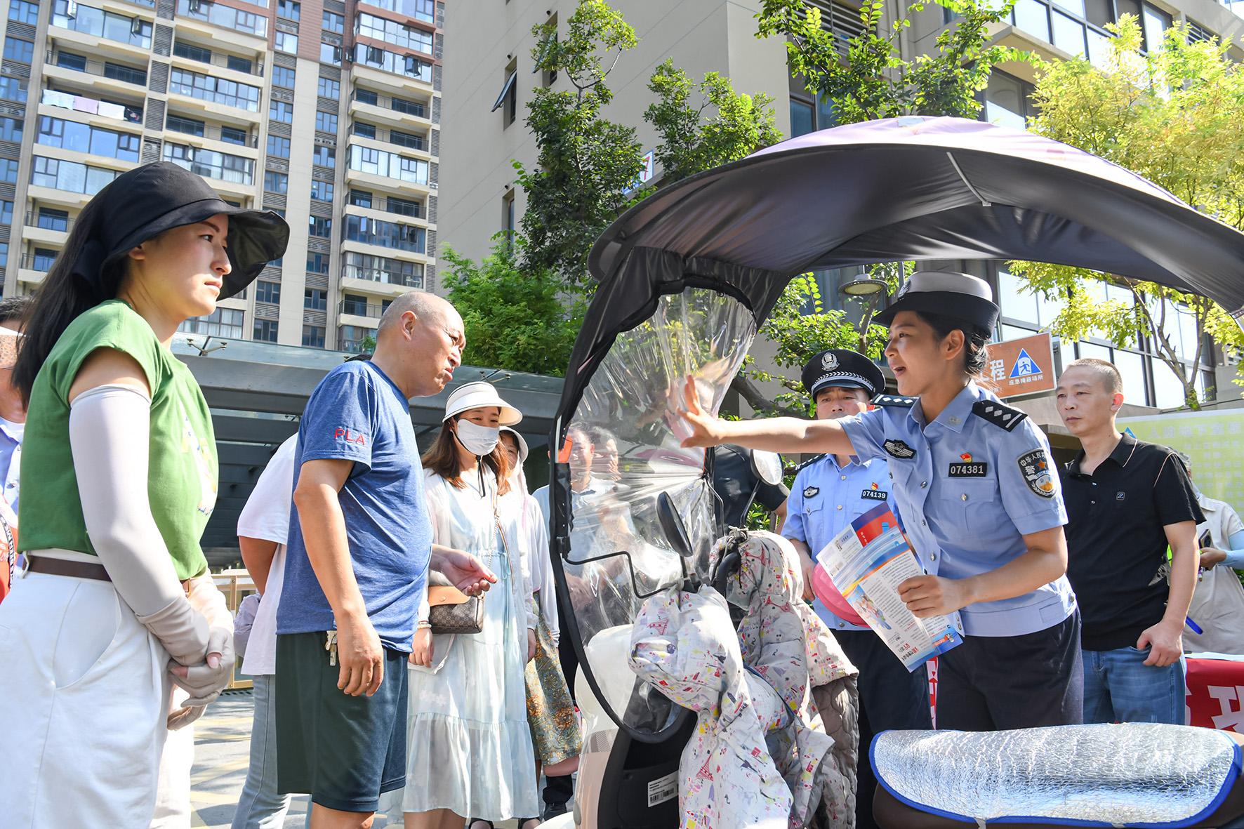 圖為民警向群眾講解電動(dòng)車(chē)遮陽(yáng)棚的危害。