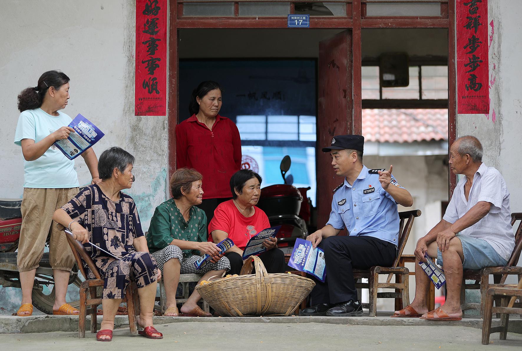 圖為8月6日,磷礦派出所民警在劉陽(yáng)村,通過(guò)拉家常、講案例等形式,向老年群體宣傳防范養(yǎng)老詐騙知識(shí)。