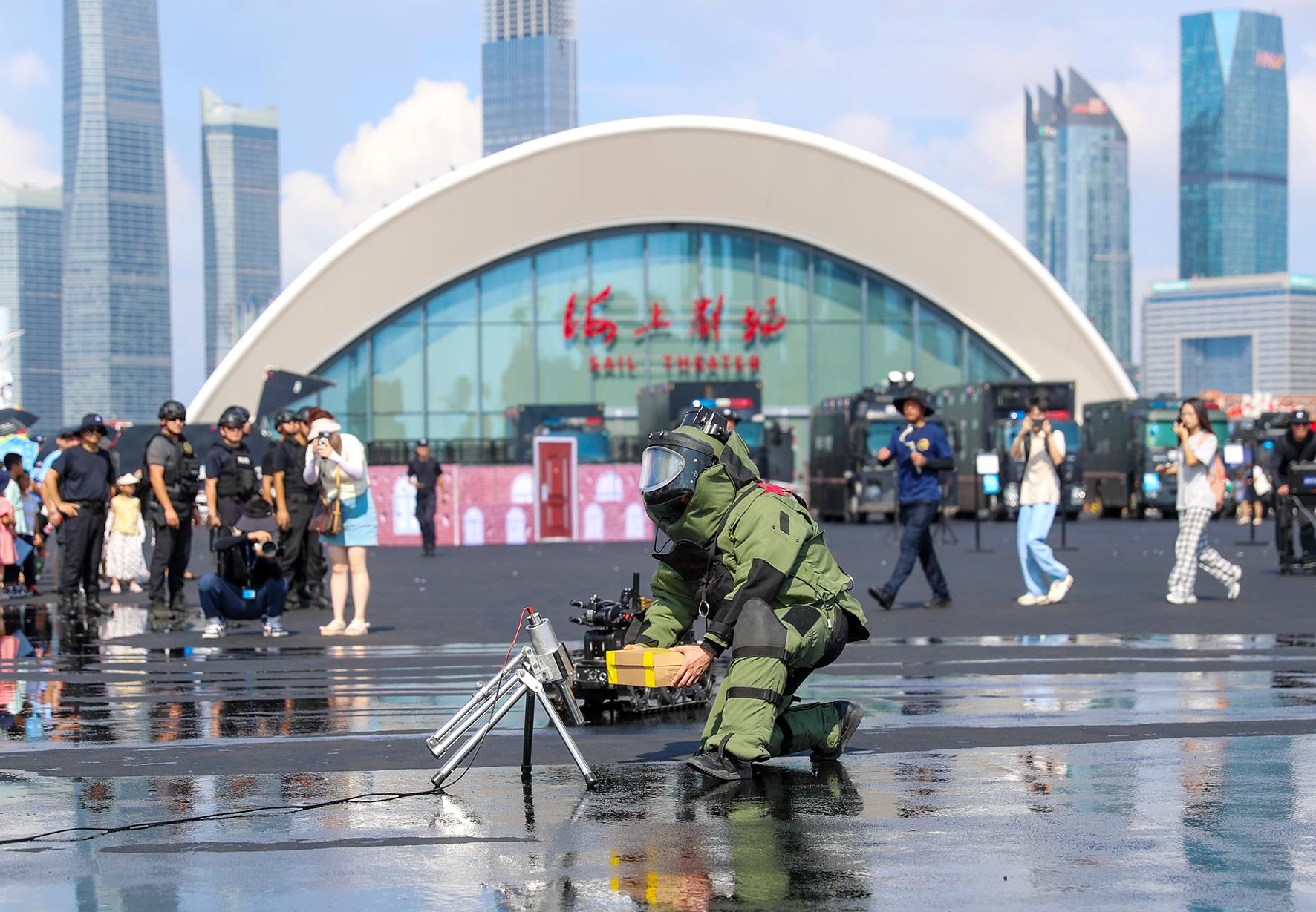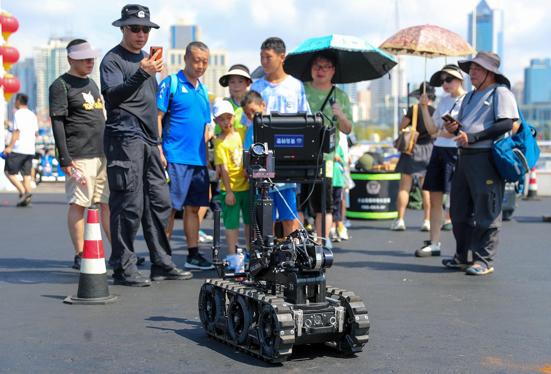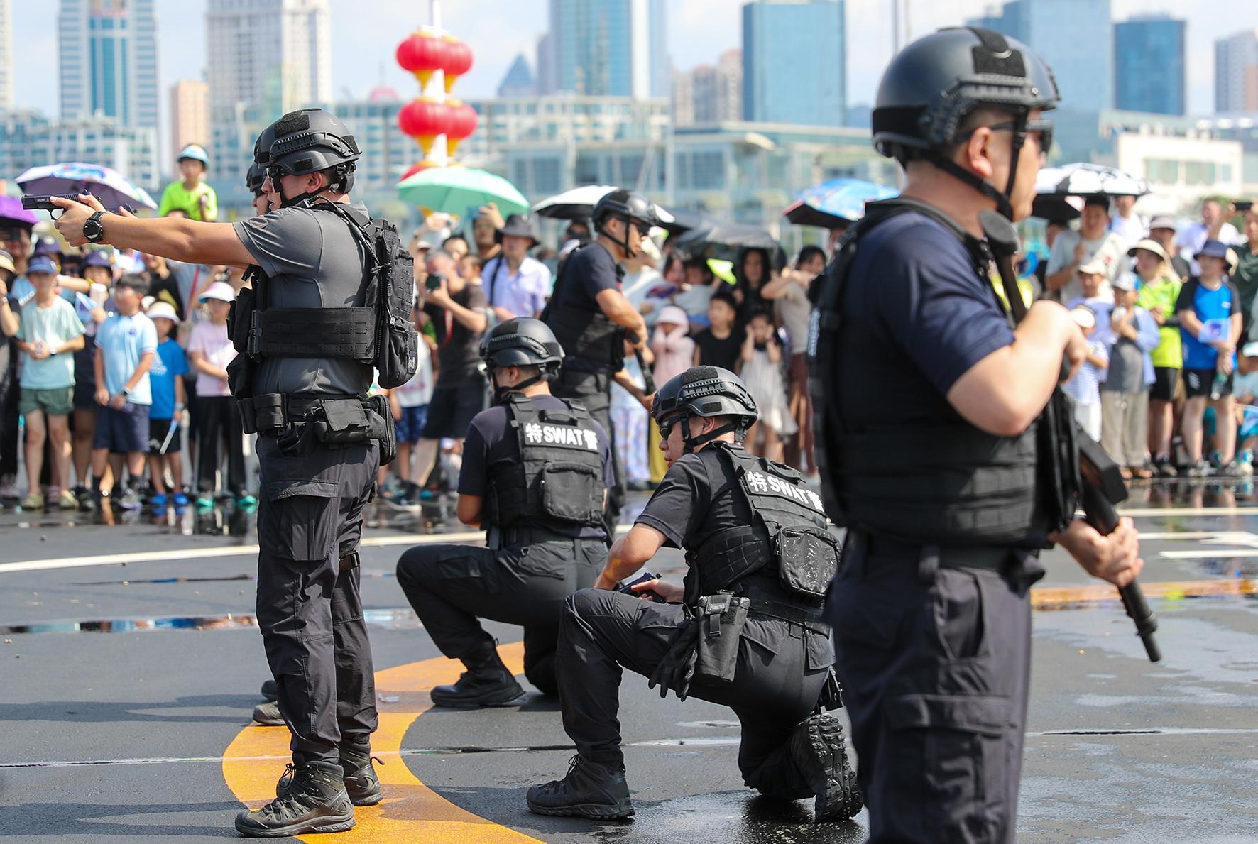 8月18日,山東省青島市公安局特警警營開放日活動在青島奧林匹克帆船中心舉行,相關(guān)警種設(shè)置展臺與市民互動,并進(jìn)行警務(wù)技能演示和警務(wù)裝備展示。
