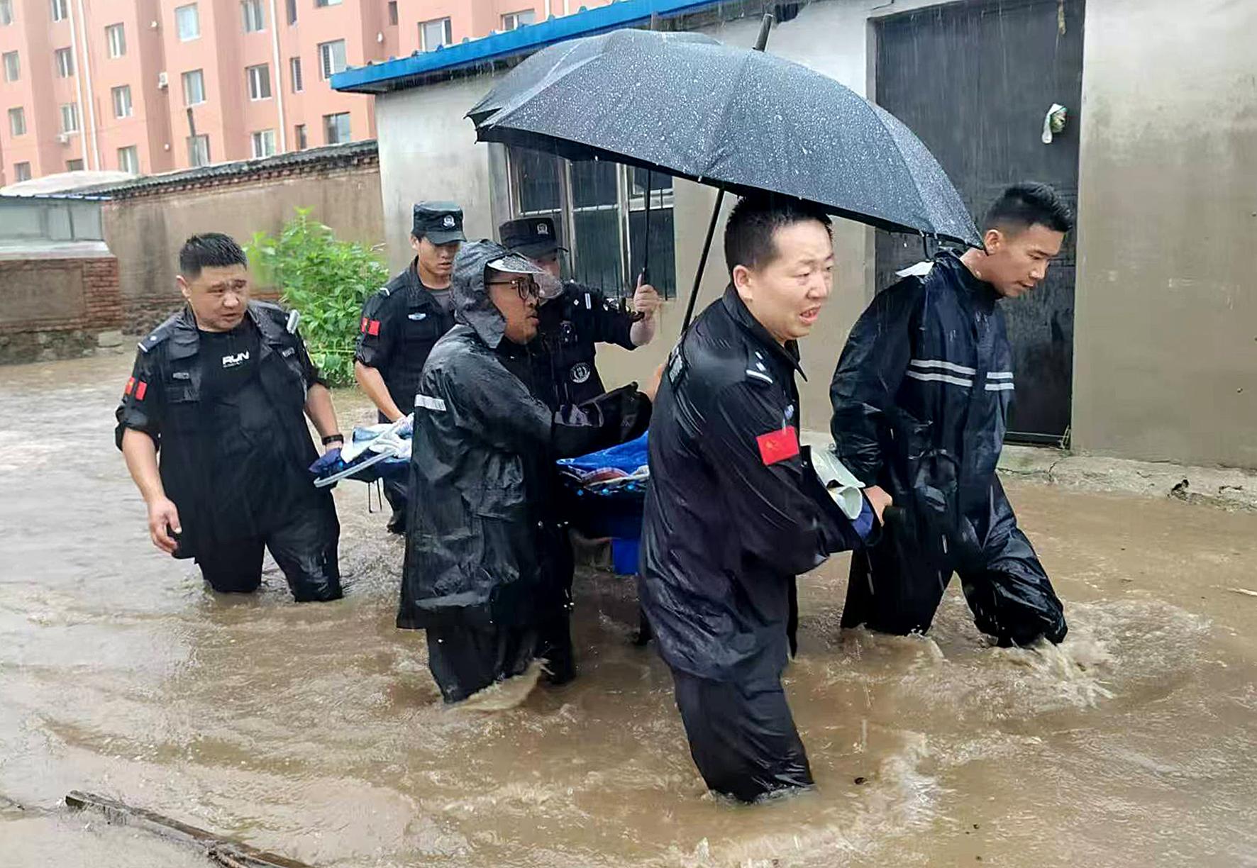 8月20日,遼寧省葫蘆島市建昌縣公安局鎮(zhèn)北派出所民輔警和巡特警隊員在暴雨中挨戶排查險情時,發(fā)現(xiàn)受災(zāi)的平房里有一位重病老人,立即用擔(dān)架將老人送往救助站。