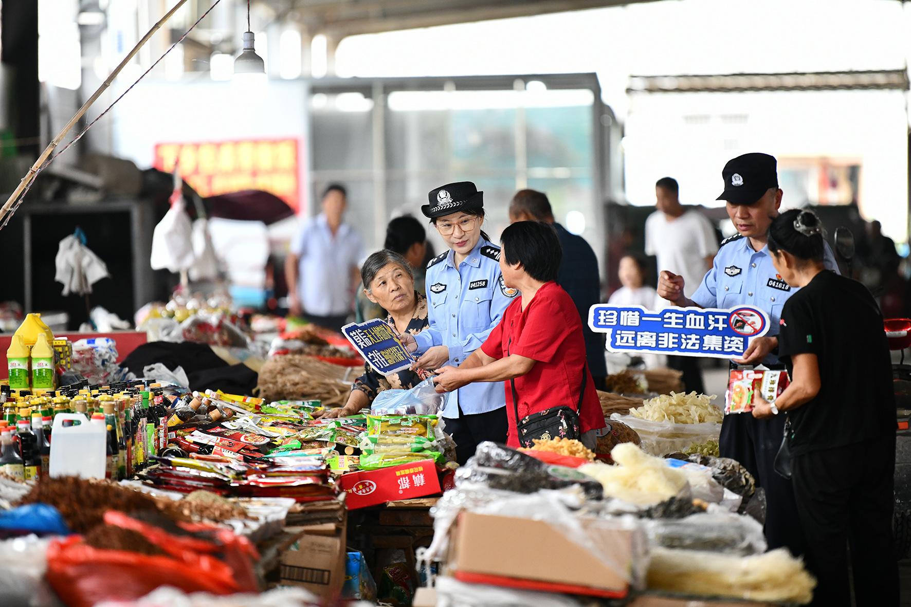 8月27日,安徽省阜南縣公安局民警在農(nóng)貿(mào)市場(chǎng)向群眾宣講養(yǎng)老詐騙、非法集資、經(jīng)營(yíng)式傳銷(xiāo)等經(jīng)濟(jì)犯罪的手段和危害性。