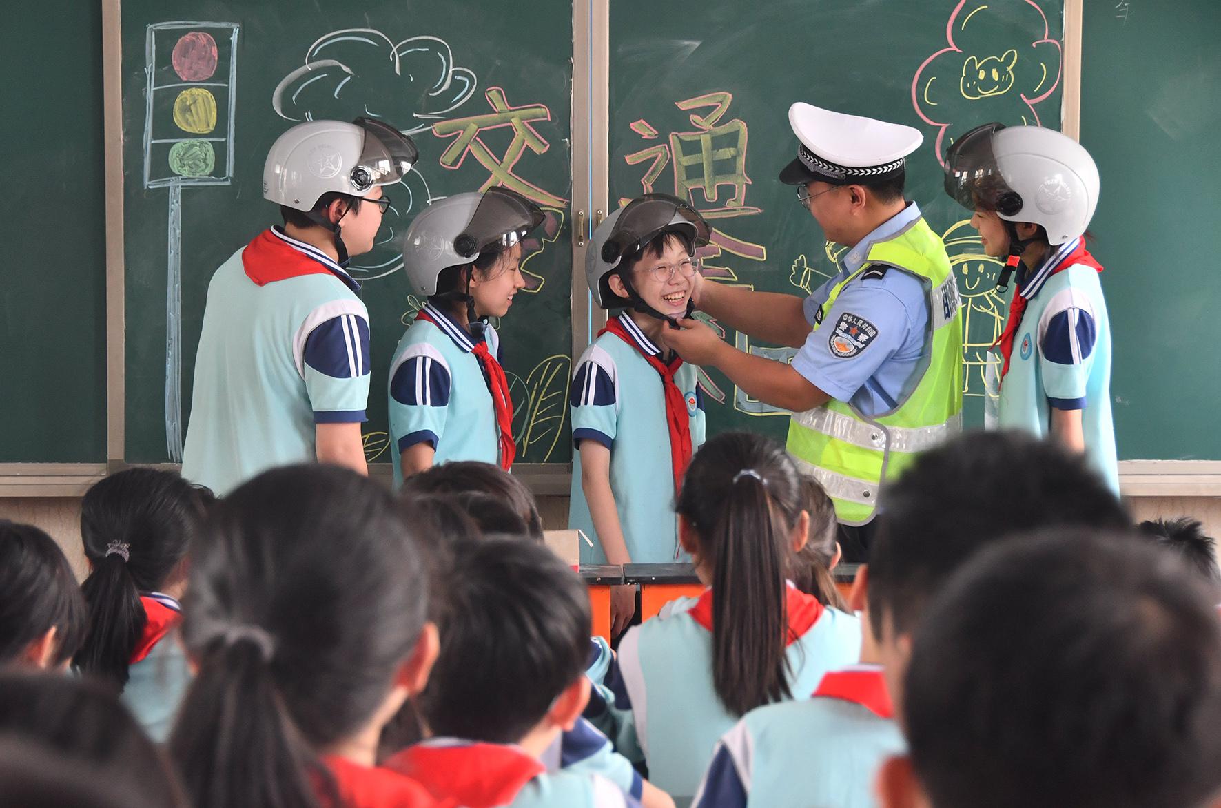 圖為民警向學生講解安全頭盔的正確佩戴方法。