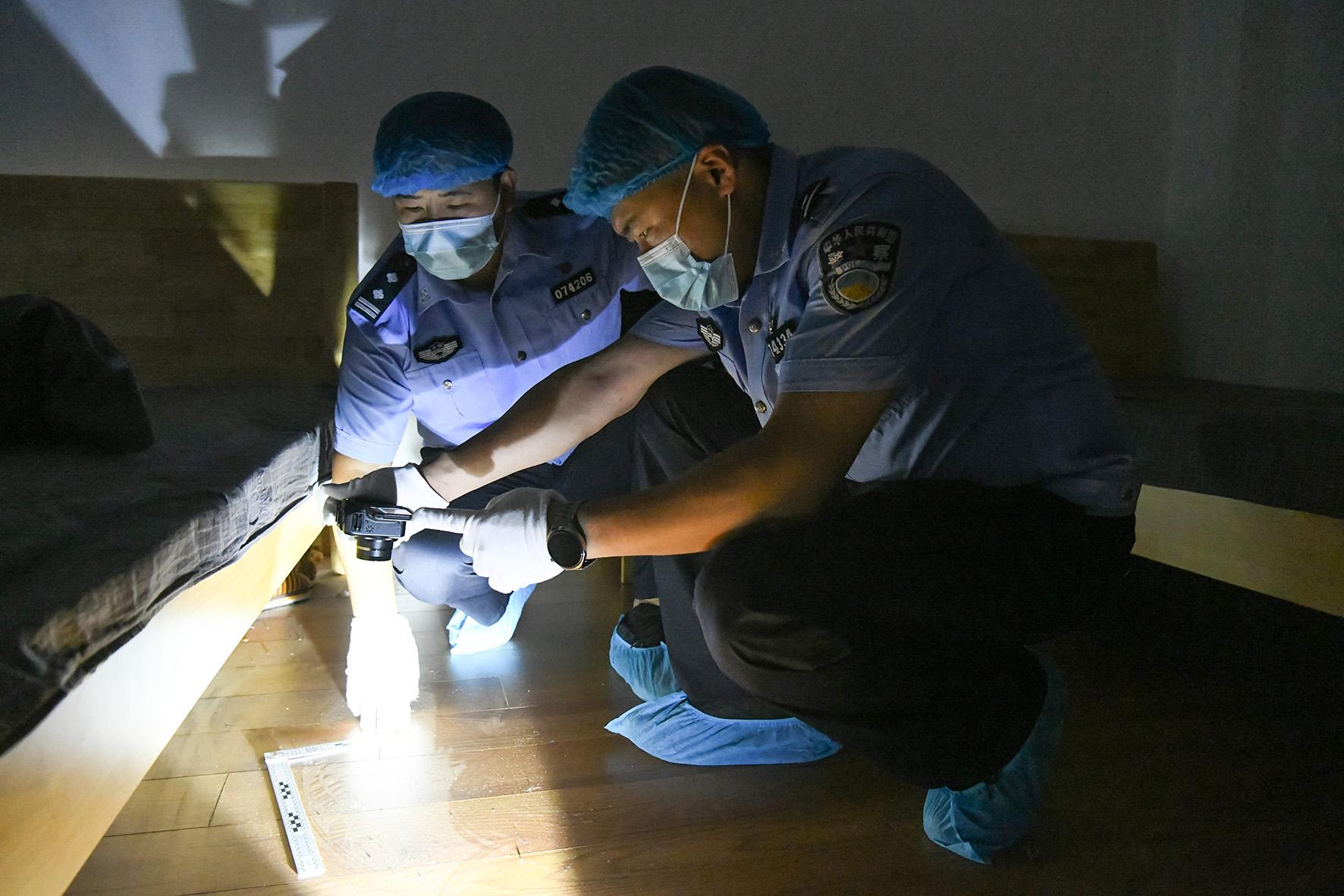 圖為刑事技術(shù)民警分析提取入室盜竊犯罪現(xiàn)場足跡。
