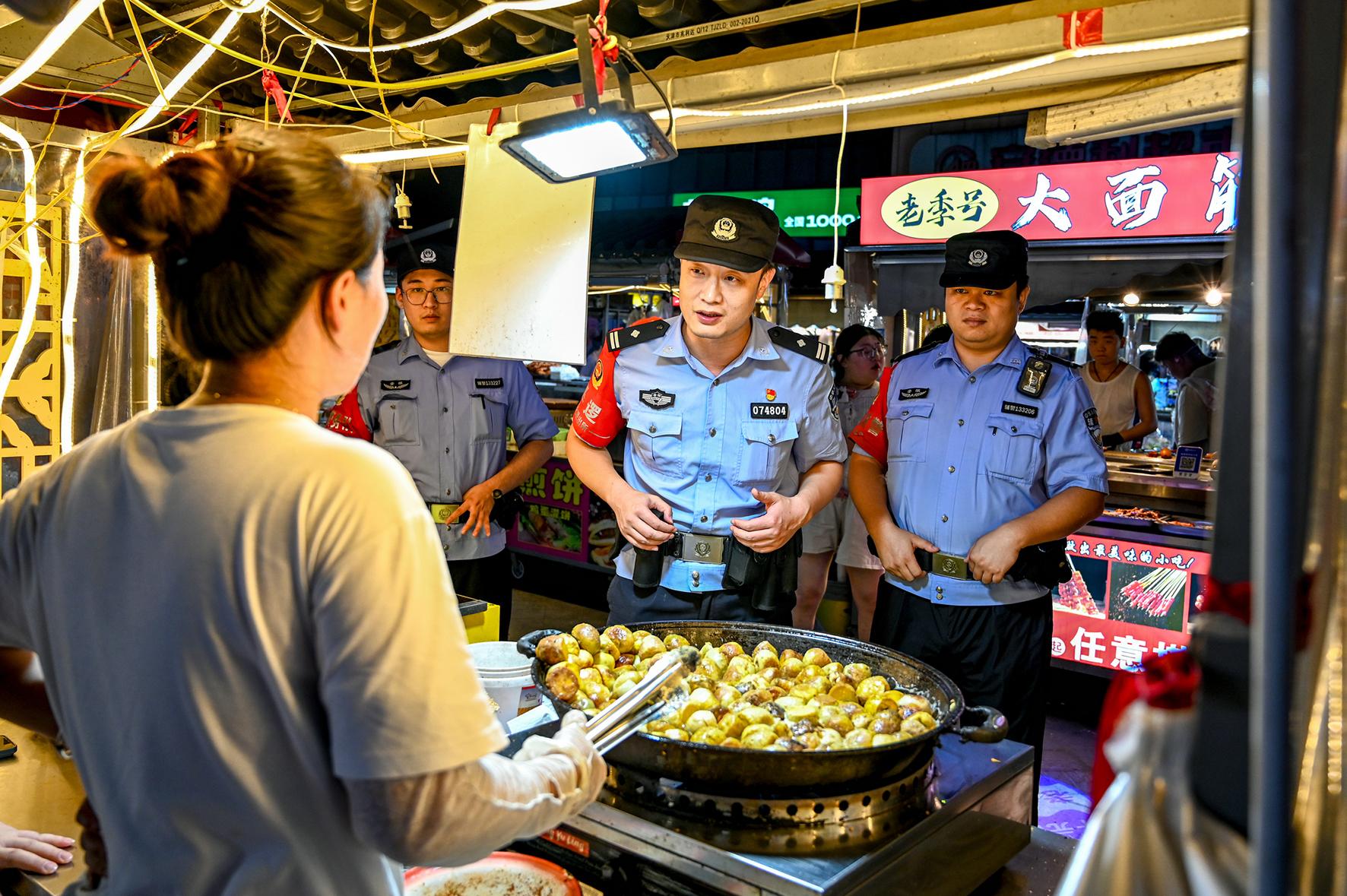 9月23日晚,安徽省馬鞍山市和縣公安局民警正在開展夜間巡邏,向市民了解治安狀況,聽取群眾對公安工作的意見和建議。今年以來,該縣公安機關(guān)全面落實“見警力、見警車、見警燈”工作要求,對重點區(qū)域、重點時段開展巡邏管控,全力提升群眾的安全感。