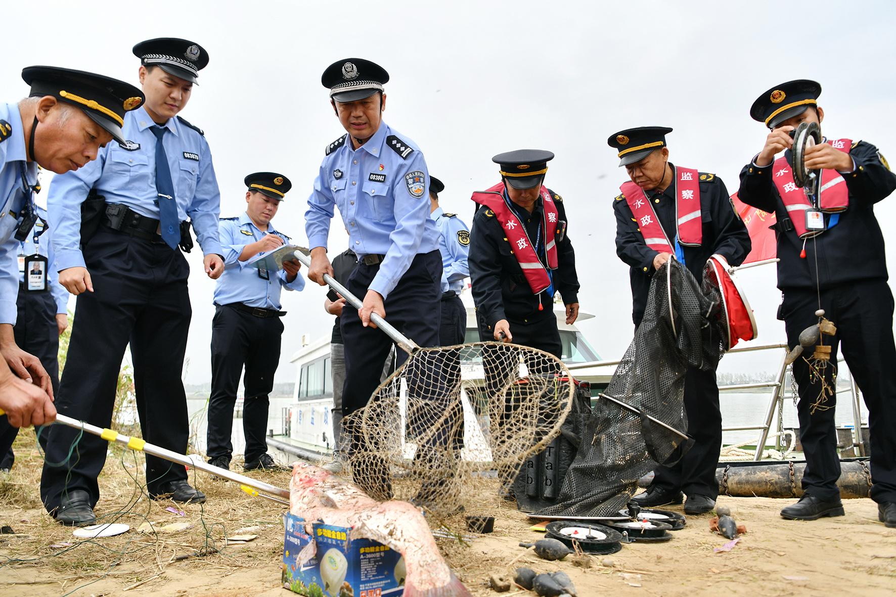 10月16日,安徽省阜南縣、霍邱縣和潁上縣的公安、農(nóng)業(yè)和水政等部門執(zhí)法人員在淮河霍邱縣流域一岸邊清點(diǎn)查獲的非法垂釣工具。為加強(qiáng)淮河橄欖蟶蚌保護(hù)區(qū)禁漁管理,阜南縣、霍邱縣和潁上縣公安、農(nóng)業(yè)和交通運(yùn)輸?shù)炔块T組織開展淮河橄欖蟶蚌保護(hù)區(qū)阜南郜臺(tái)段打擊非法垂釣聯(lián)合執(zhí)法專項(xiàng)行動(dòng),嚴(yán)厲打擊非法捕撈、非法垂釣,保護(hù)淮河生態(tài)環(huán)境及水生生物資源。