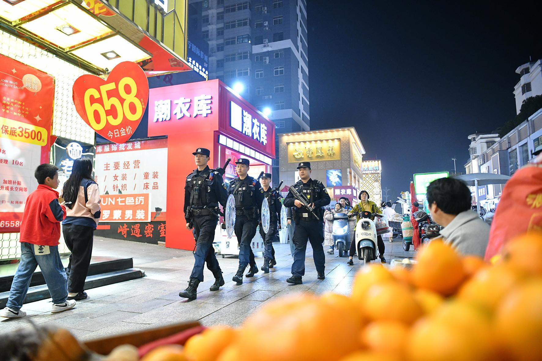 11月15日晚,安徽省阜南縣公安巡警在城區(qū)一商業(yè)步行街巡邏。阜南縣公安局巡防大隊加大夜間巡邏力度,采取車巡、步巡和視頻巡等相結(jié)合方式,對轄區(qū)主要街道、商業(yè)區(qū)和公園等人員密集場所和重點區(qū)域進(jìn)行不間斷巡邏,排查消除安全隱患,增強人民群眾的安全感、幸福感。