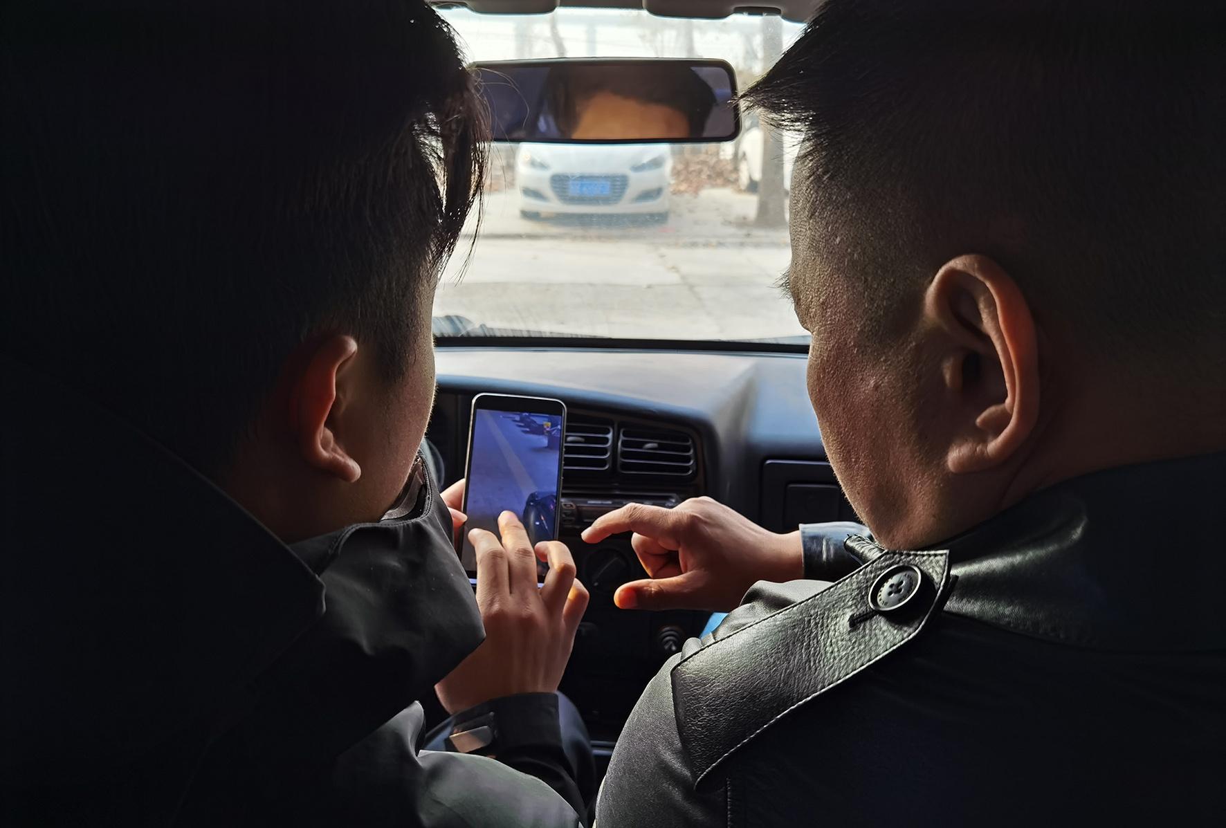 1、偵查行動(dòng)隊(duì)民輔警在路上查看在逃人員信息。