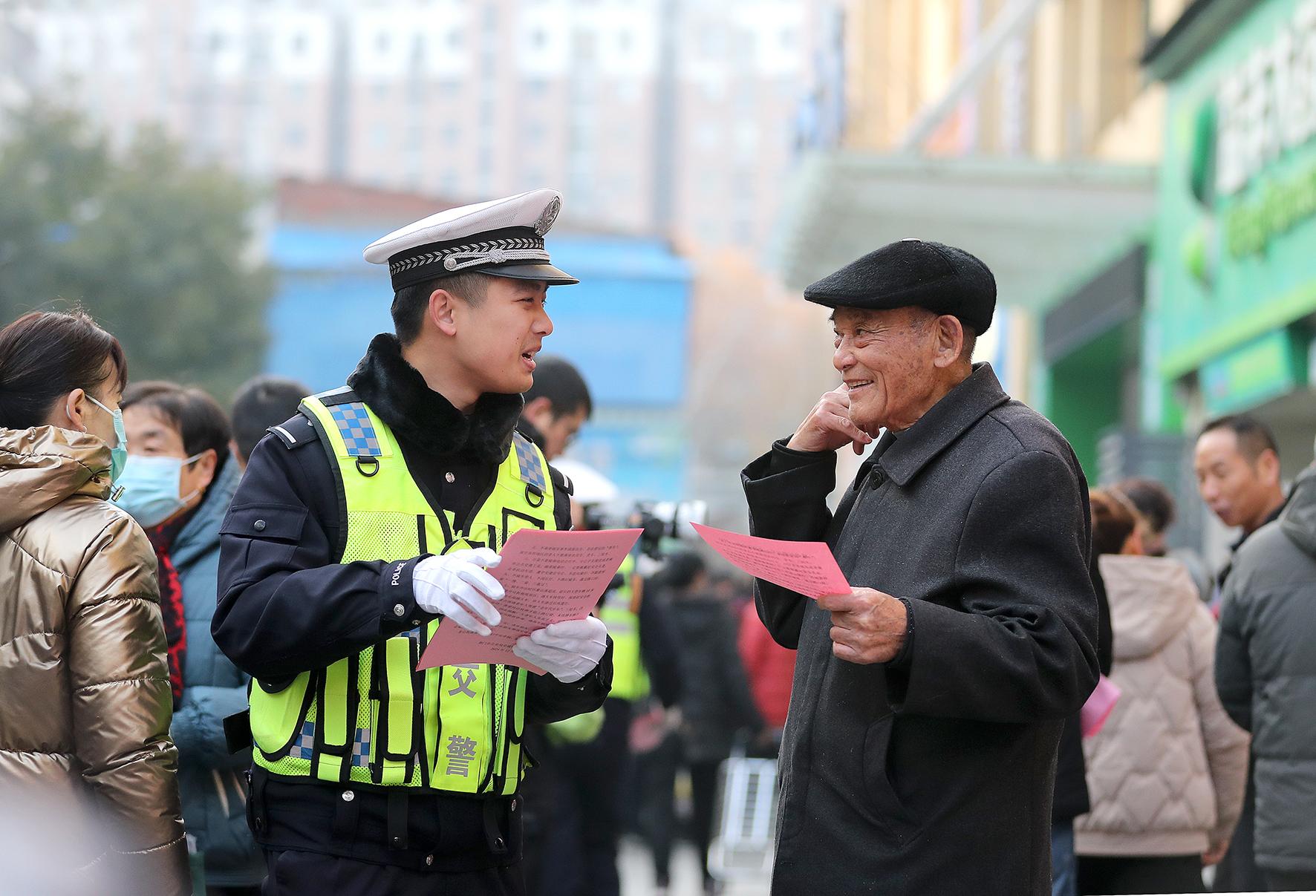 12月13日,湖北省荊門市公安局交警支隊(duì)東寶大隊(duì)民警在南臺(tái)菜市場(chǎng),將《致老年交通參與者一封信》逐句地念給老年人聽,倡議老年朋友們自覺遵守交通法規(guī),平安出行。