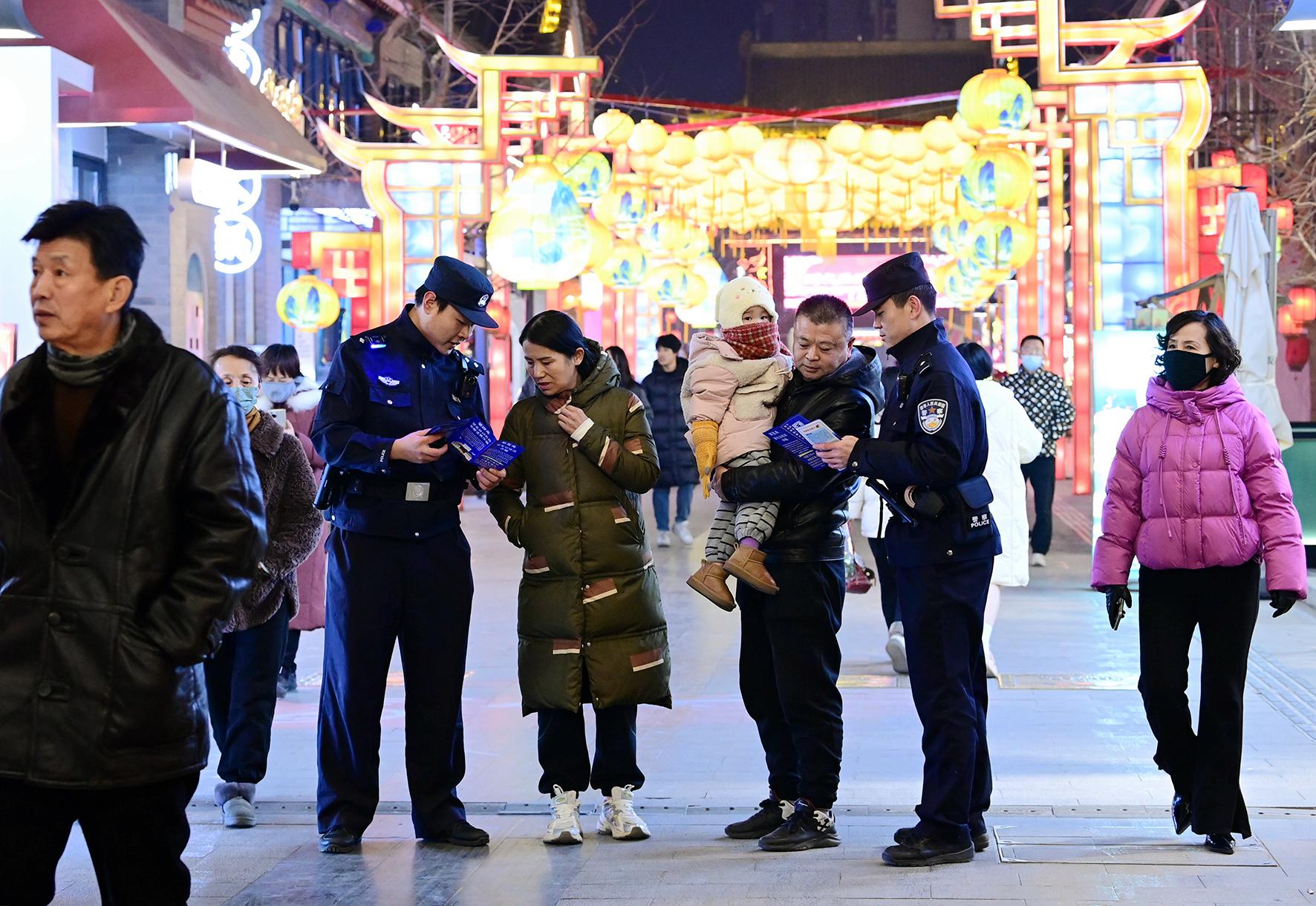 12月24日晚,甘肅省蘭州市公安局七里河分局土門墩派出所民警在蘭州老街巡邏,向游客宣傳反詐知識(shí)。